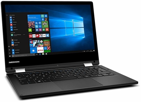 Ordenador portátil Medion E2221T con pantalla de 11.6 pulgadas LCD retroiluminada por LED multitáctil y abatible, resolución HD 1366 x 768 píxeles, función pc y función tablet, sistema operativo Windows 10 con arquitectura de 64-bits, procesador Intel Atom de cuatro núcleos x5-Z8350 a 1.44GHz, memoria interna eMMC de 32GB, memoria RAM DDR3L de 2GB, gráficos Intel HD Graphics, conexión inalámbrica WiFi802.11ac, Bluetooth4.1, batería de 2 celdas.