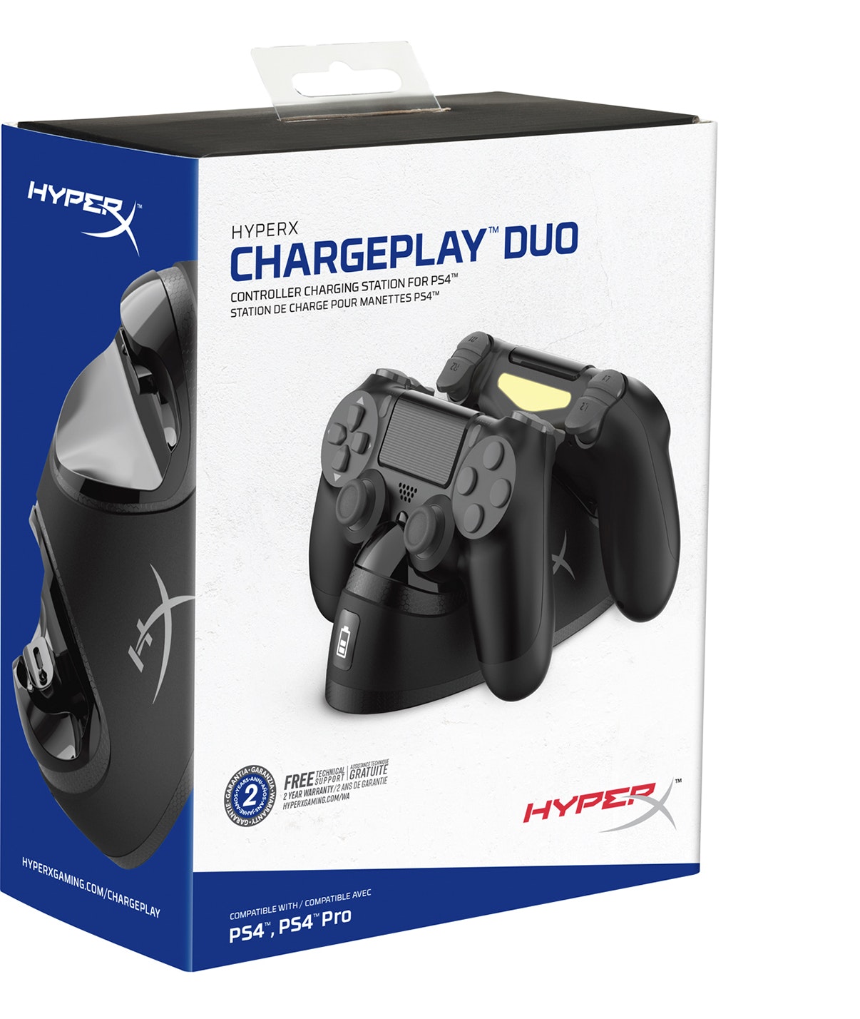 Carga. Juega. Repite.\nCarga rápidamente 2 mandos inalámbricos DUALSHOCK®4.\n\nCarga dos mandos inalámbricos DUALSHOCK®4 de forma simultánea y comienza a jugar gracias a HyperX ChargePlay™ Duo. Así tendrás siempre listo un segundo mando para las largas sesiones de juego o para varios jugadores. Conecta los mandos de la PS4™ al puerto EXT y obtén una carga completa en dos horas. ChargePlay Duo cuenta con una base sólida y un práctico diseño con un acoplamiento de clic sencillo y seguro; además, los indicadores de batería de 3 niveles muestran el estado de carga de los mandos de un vistazo. HyperX ChargePlay Duo incluye una garantía de dos años y soporte técnico gratuito.