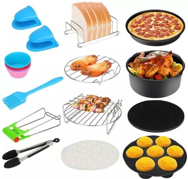 Estos accesorios son perfectos para hacer todas sus comidas en nuestra freidora sin aceite..Son anti adherentes, bastante resistentes al calor, duraderos y fáciles de limpiar..¡Solo con estos accesorios podrán hacer pan, pasteles, cupcakes, pizza, carne de parrilla, hornear en rodajas, tostadas de pan y más!.Con nuestro libro de cocina puedes tener grandes ideas para probar nuevos sabores..Nuestros accesorios se pueden lavar en el lavavajillas, lo que hace que todo el proceso sea mucho más fácil..Diámetro del objeto: 18-20 cm.Está incluido.1 x plato de pizza.1 x cesta profunda.1 x alfombra de silicona.Formulario de 1 x cupcakes.1 x parrilla.1 x cuadrícula para brochetas.1 x soporte de pan.Documento de pergamino de 100 x.1 x guantes.1 x Tenaz.1 x cepillo.Libro de recetas de 1 x