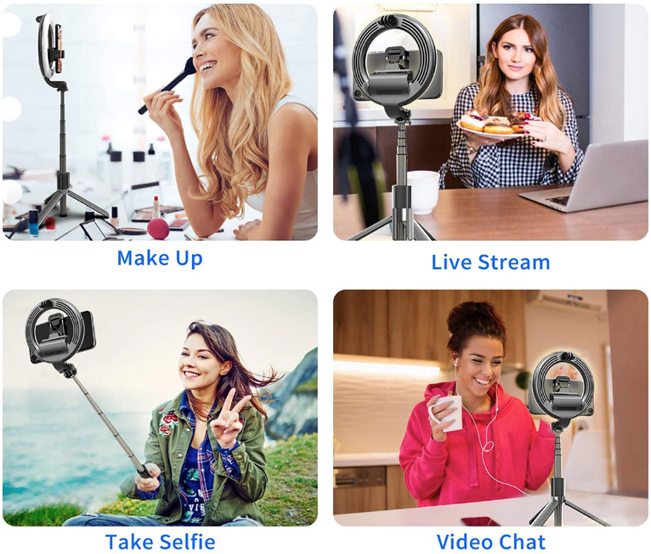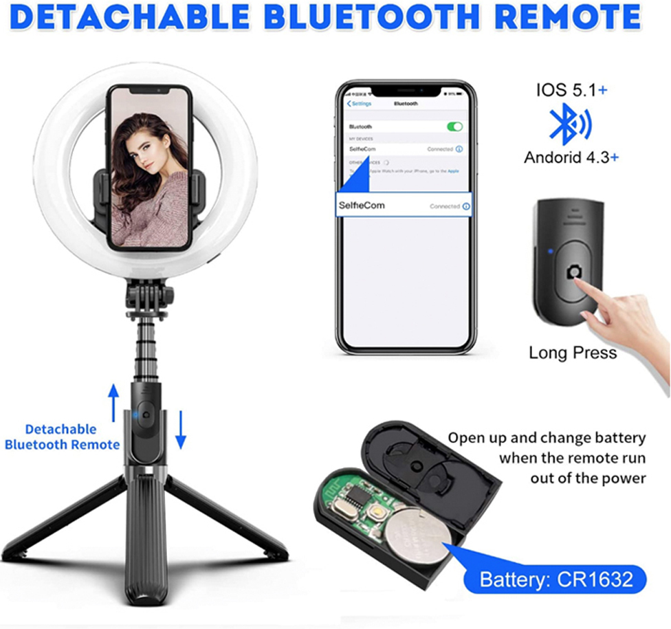 Luz de Anillo, Palo Selfie Stick LED con Trípode Control Remoto Inalámbrico 3 Colores para Móvil Selfie Maquillaje L07 TikTok. El palo selfie y la luz del anillo están diseñados en uno, te ayudará a eliminar todas las sombras en tu rostro y a iluminar tus ojos al mismo tiempo cuando tomes selfie. combinado con un palo extensible de aluminio premium, el palo selfie es extremadamente estable.(No necesita instalación adicional).