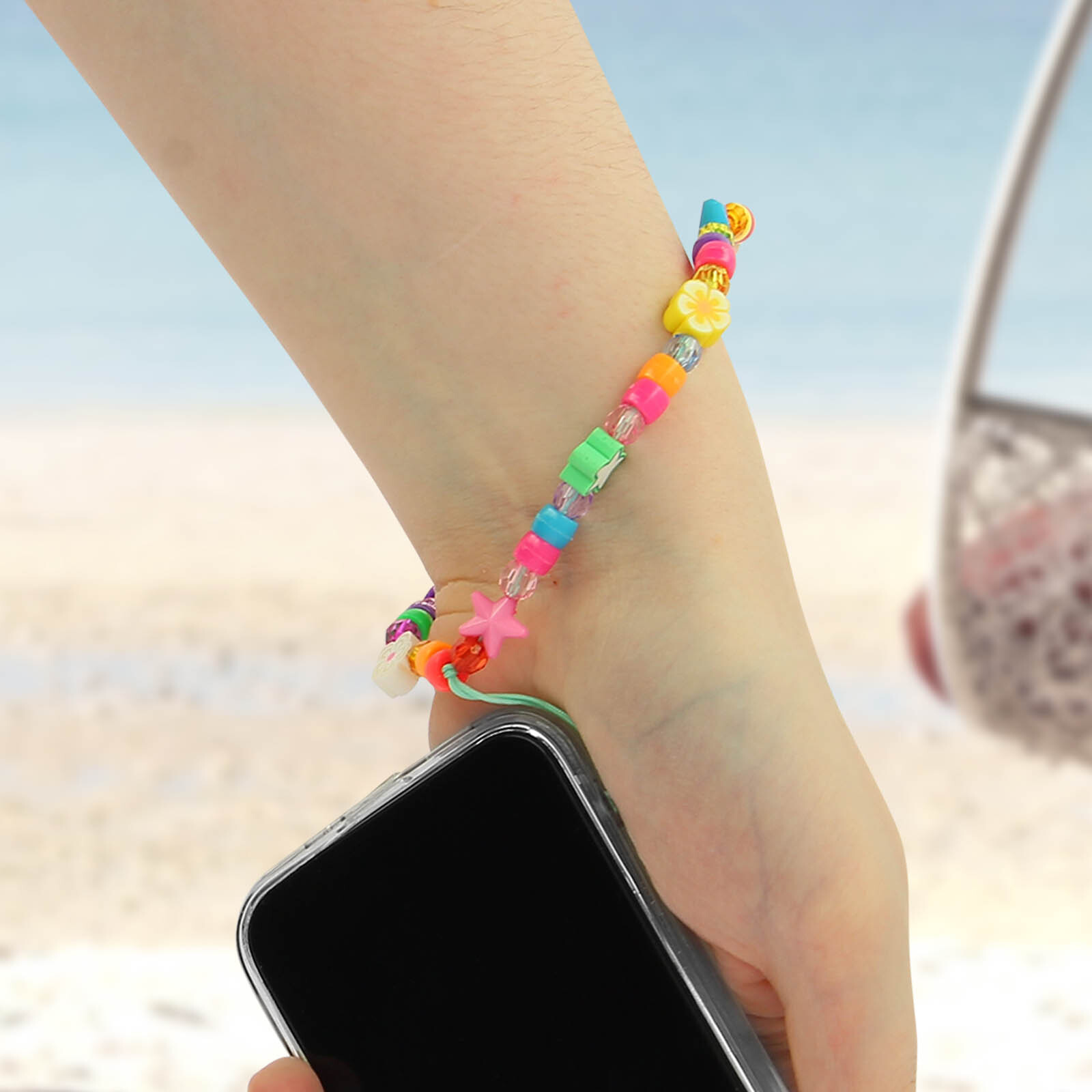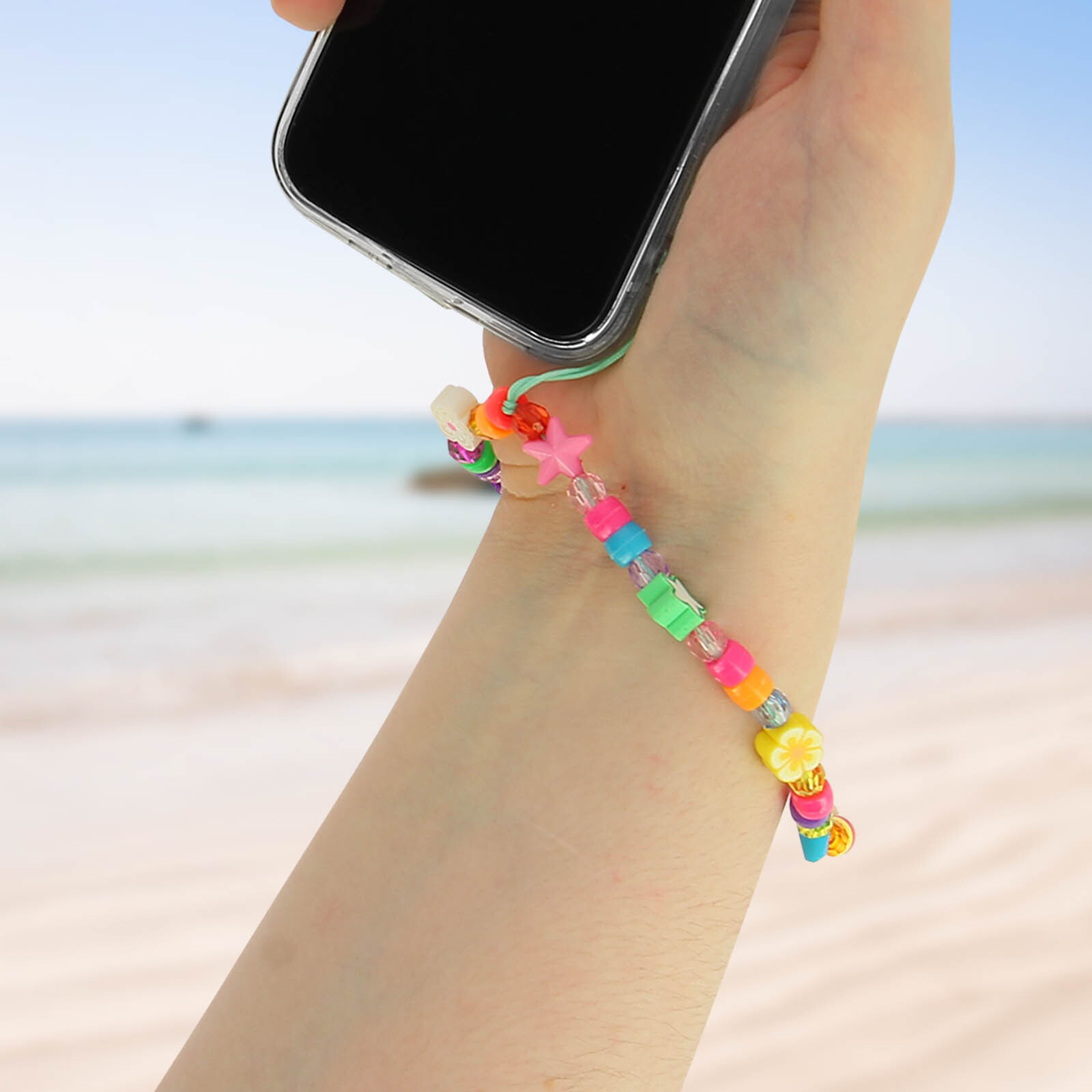 Joya para teléfono Beads and Stars Summer Collection. Compatible con todas las fundas y carcasas protectoras gracias a su resistente lazo de sujeción. Longitud 25 cm. Hecho con cuentas de cristal, decorado con estrellas y flores. Diseño atractivo. • Características y Puntos fuertes: Pulsera de teléfono estilo Homemade original,de la colección Summer. Sus colgantes kawai coloridos te recordarán los veranos en la playa : cuentas cristal, estrellas, flores. Pulsera chula y colorida para llevar el móvil en la muñeca. Compatible con todas las carcasas y fundas protectoras