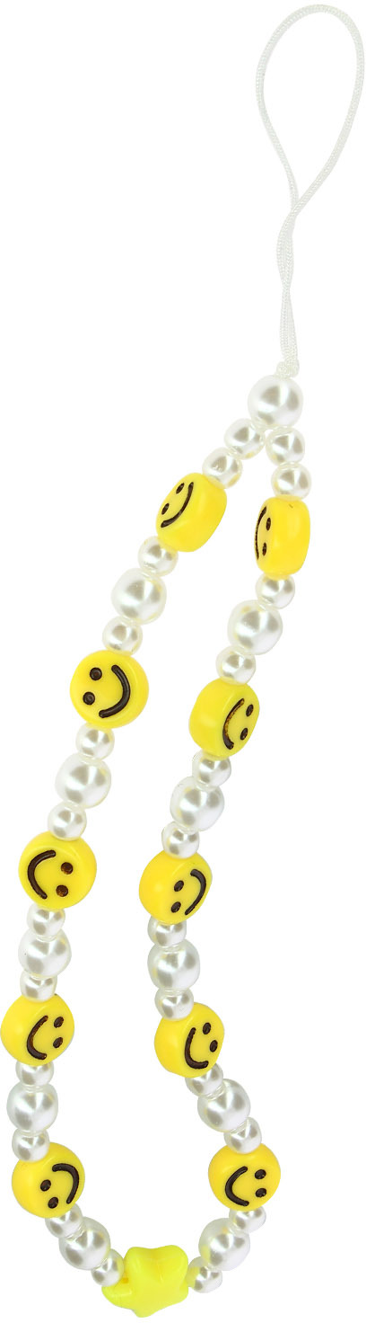 Joya de teléfono de la Colección Smiley. Estilo artesanal. Compatible con todas las fundas y carcasas de protección gracias a su sólido lazo de sujeción. Longitud 25cm. Hecha con cuentas redondas, una estrella y emoticonos sonrientes. • Características y Puntos fuertes: Pulsera para móvil de estilo casero de lo más original, de la colección Smile. Compuesto por cuentas redondas blancas, una estrella y sonrientes emoticonos amarillos.. Pulsera kawaii y divertida para sujetar el móvil en la muñeca. Compatible con todas las fundas y fundas protectoras.