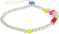 Joya del teléfono Love, Collection Lovely. Compatible con fundas y carcasas gracias a su sólido lazo de sujeción. Circunferencia 25cm. Hecha con cuentas redondas blancas, una perla amarilla, una flor y colgantes de corazón multicolor.