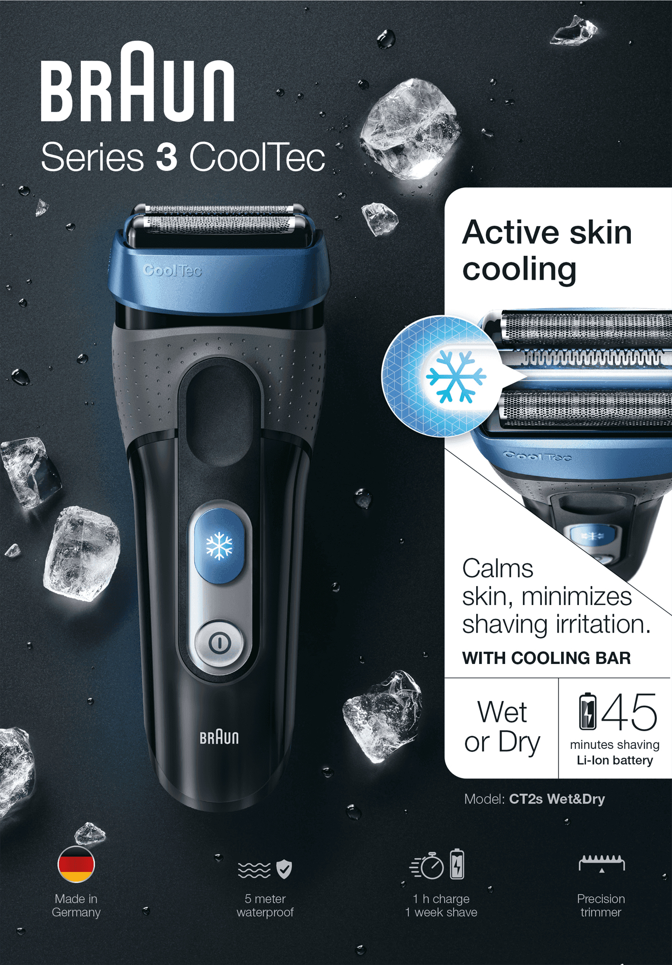 Braun °CoolTec CT2s. Sistema de afeitado: Máquina de afeitar de láminas. Color del producto: Negro, Azul, Gris. Fuente de energía: Batería, Tecnología de batería: Ión de litio, Tiempo de carga: 1 h. Peso: 528 g. Tipo de embalaje: Caja, Ancho del paquete: 67,5 mm, Profundidad del paquete: 155 mm