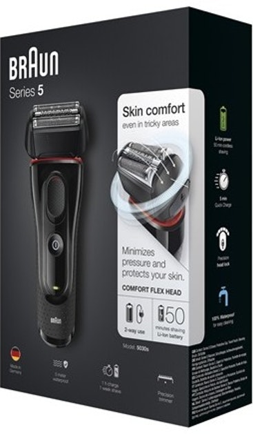 Braun 5-5030S. Sistema de afeitado: Máquina de afeitar de láminas. Color del producto: Negro, Rojo, Indicadores LED: Poder. Fuente de energía: AC/Batería, Tecnología de batería: Ión de litio, Tiempo de funcionamiento: 45 min. Peso: 437 g. Tipo de embalaje: Caja, Ancho del paquete: 80 mm, Profundidad del paquete: 150 mm