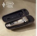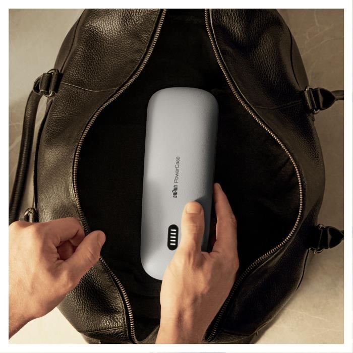 Braun PowerCase, el primer estuche de carga para afeitadora del mundo. El estuche ofrece hasta un 50 % más de duración de la batería o hasta 6 semanas de afeitado sin cable. Fabricada con materiales duraderos de primera calidad y diseñada para proteger su afeitadora de golpes, raspaduras, polvo y derrames