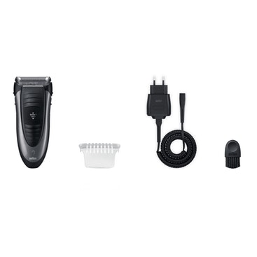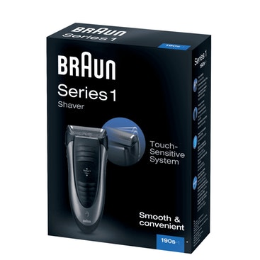 Braun Series 1 190-1. Sistema de afeitado: Máquina de afeitar de láminas. Color del producto: Gris. Fuente de energía: AC/Batería, Tecnología de batería: Níquel-metal hidruro (NiMH), Tiempo de carga: 1 h. Peso: 273 g. Tipo de embalaje: Caja, Ancho del paquete: 57 mm, Profundidad del paquete: 155 mm