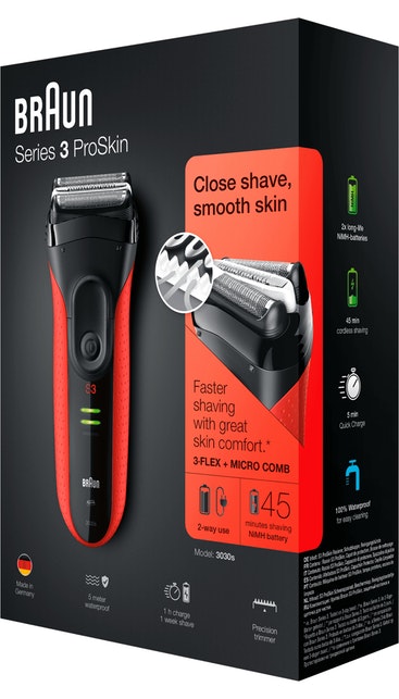 Braun Series 3 3030s. Sistema de afeitado: Máquina de afeitar de láminas. Color del producto: Negro, Rojo, Tipo de visualizador: LED, Indicadores LED: Poder. Fuente de energía: AC/Batería, Tecnología de batería: Níquel-metal hidruro (NiMH), Tiempo de carga: 1 h. Peso: 392 g, Peso de la batería: 22 g. Tipo de embalaje: Caja, Ancho del paquete: 67,5 mm, Profundidad del paquete: 155 mm