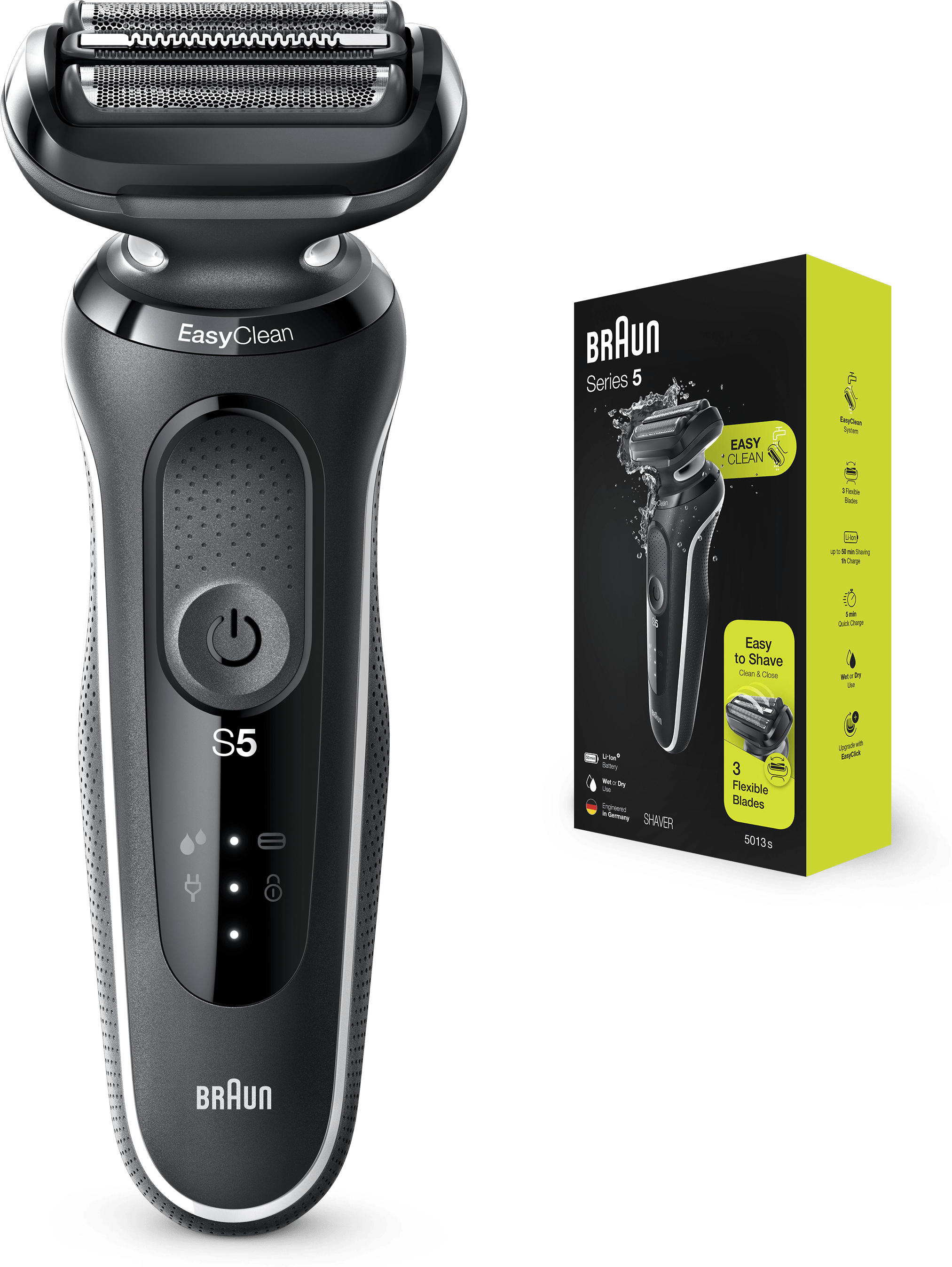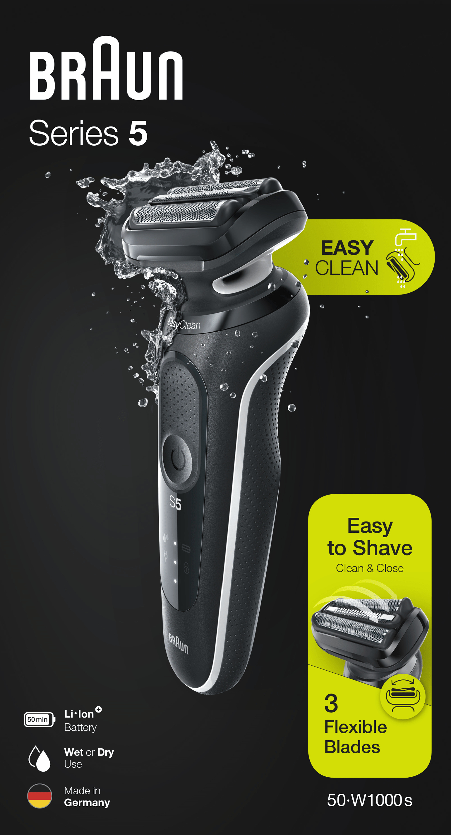 Braun Series 5 50-W1000s. Sistema de afeitado: Máquina de afeitar de láminas. Color del producto: Blanco, Tipo de visualizador: LED. Fuente de energía: Batería, Tecnología de batería: Ión de litio, Tipo de batería: Batería integrada. Peso: 291 g, Peso de la batería: 18,6 g. Tipo de embalaje: Caja, Ancho del paquete: 67 mm, Profundidad del paquete: 137 mm