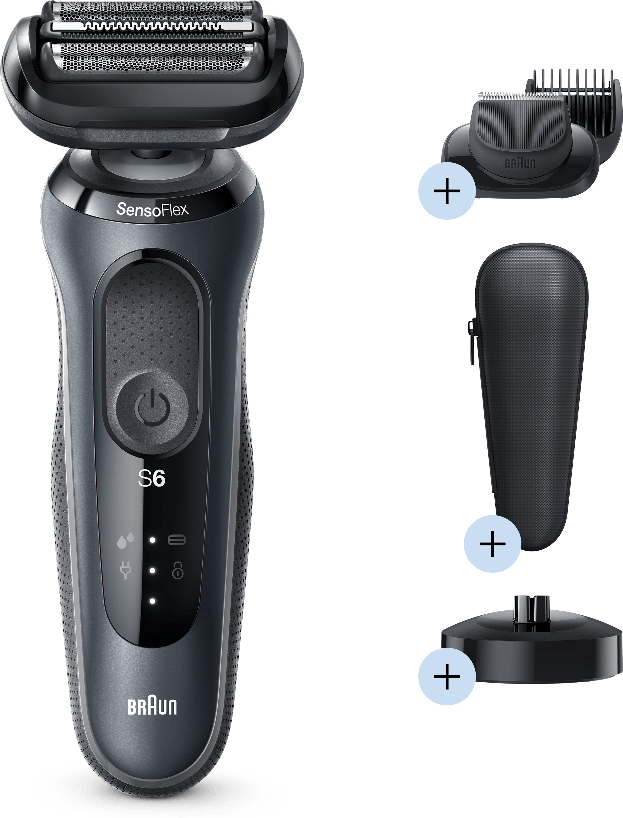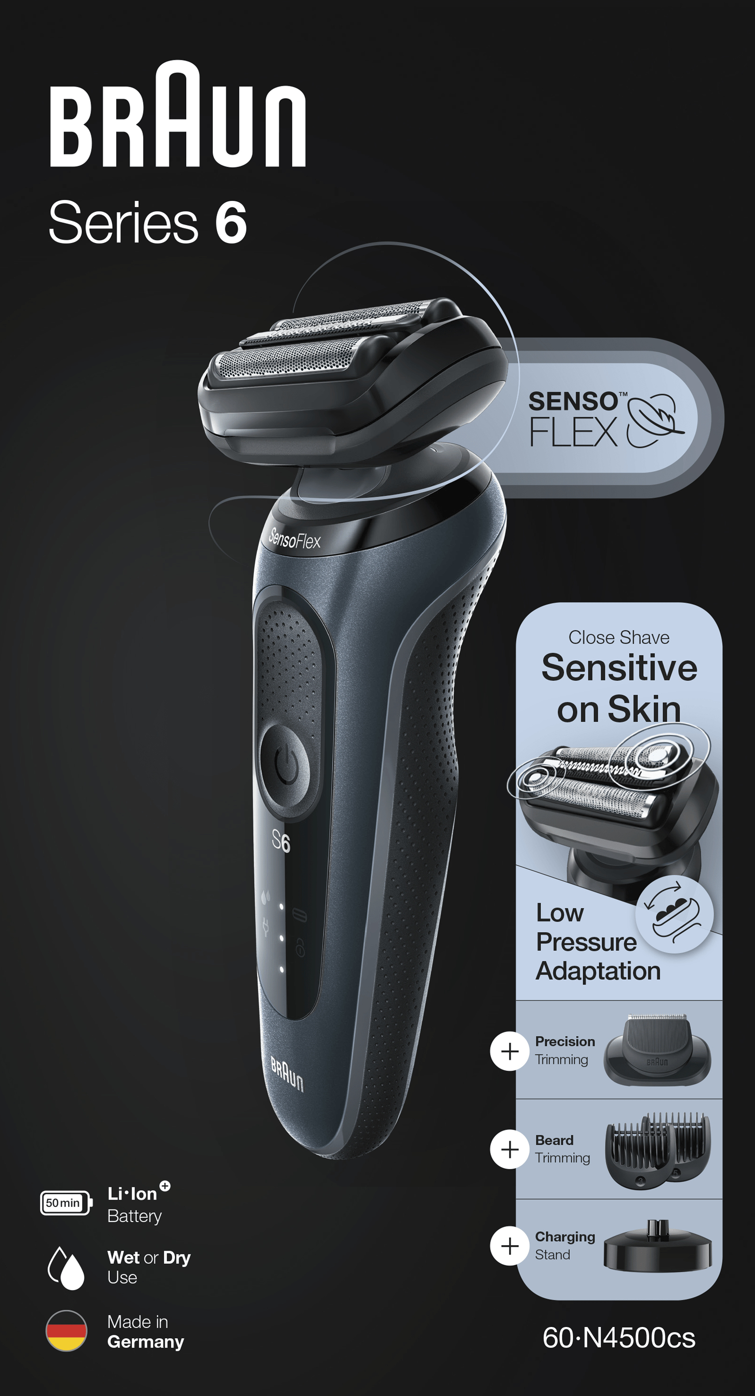 Braun Series 6 60-N4500cs. Sistema de afeitado: Máquina de afeitar de láminas. Color del producto: Gris, Tipo de visualizador: LED. Fuente de energía: Batería, Tecnología de batería: Ión de litio, Tipo de batería: Batería integrada. Peso: 453 g, Peso de la batería: 18,6 g. Tipo de embalaje: Caja, Ancho del paquete: 67 mm, Profundidad del paquete: 137 mm