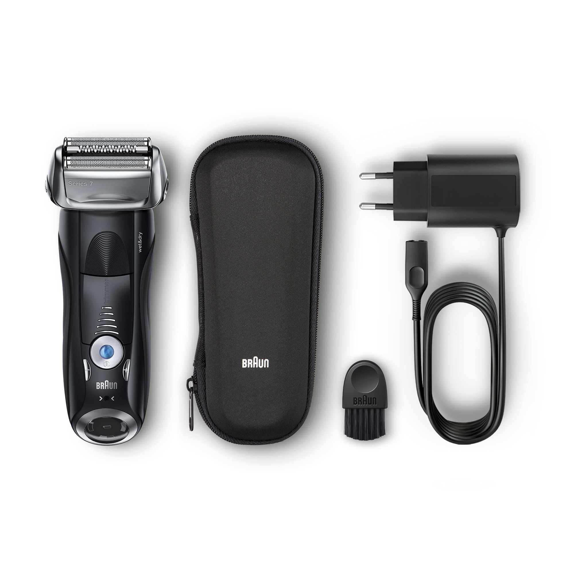 Braun Series 7 7840s Wet&Dry. Sistema de afeitado: Máquina de afeitar de láminas. Color del producto: Negro. Fuente de energía: Batería, Voltaje de entrada AC: 100-240 V. Peso: 460 g. Ancho del paquete: 67 mm, Profundidad del paquete: 155 mm, Altura del paquete: 222 mm