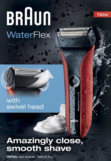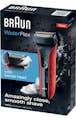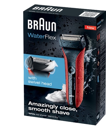 Braun WaterFlex WF2s. Sistema de afeitado: Máquina de afeitar de láminas. Color del producto: Negro, Rojo. Fuente de energía: Batería, Tecnología de batería: Ión de litio, Tiempo de carga: 1 h. Peso: 320 g. Ancho del paquete: 57 mm, Profundidad del paquete: 155 mm, Altura del paquete: 222 mm