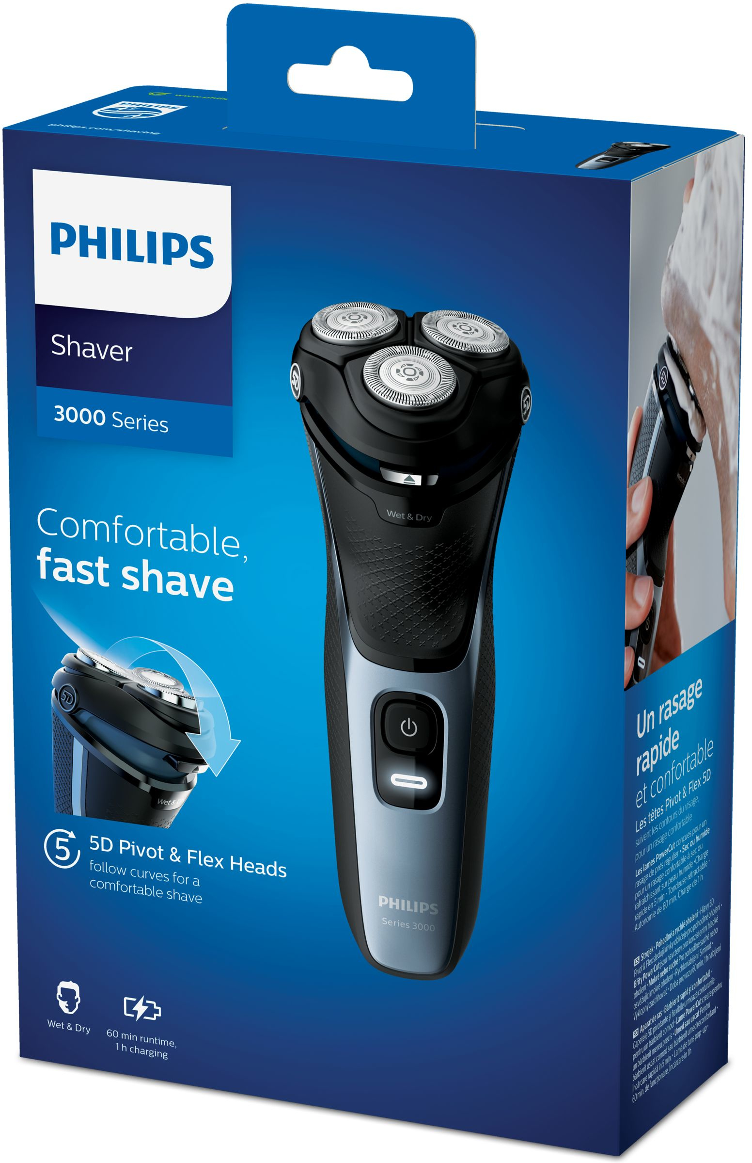 La afeitadora Philips Shaver Series 3000 proporciona un afeitado cómodo y confortable. Sus cabezales pivotantes y flexibles 5D, el sistema de cuchillas PowerCut y la función de mojado o seco proporcionan un resultado limpio y cómodo.