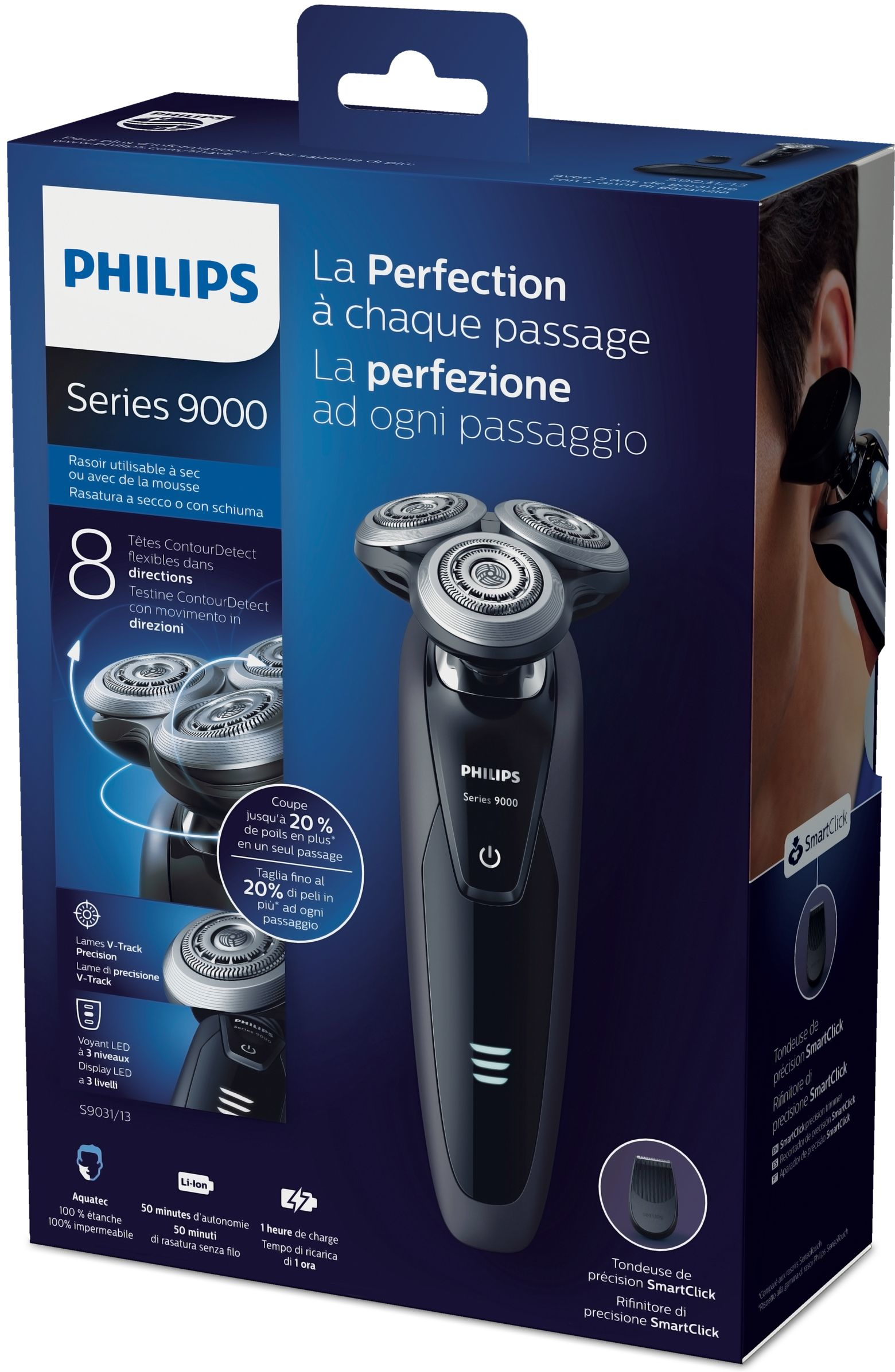 Philips S9031/13, SHAVER Series 9000. Color del producto: Negro, Gris. Fuente de energía: AC/Batería, Tecnología de batería: Ión de litio, Tiempo de carga: 1 h. Tiempo de funcionamiento: 50 min, Característica(s) de mango: Ergonómico