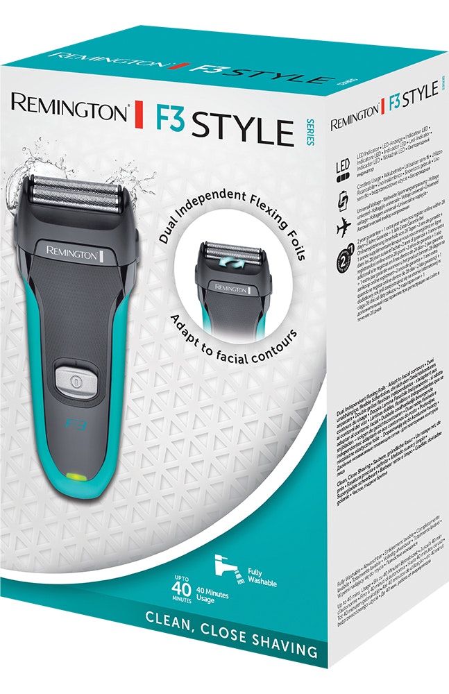 Remington F3000. Sistema de afeitado: Máquina de afeitar de láminas. Color del producto: Negro, Verde, Indicadores LED: Carga. Fuente de energía: Batería, Tiempo de afeitado: 40 min. Altura: 135 mm