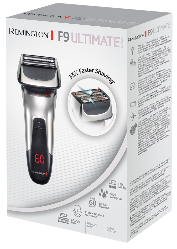 Remington XF9000. Sistema de afeitado: Máquina de afeitar de láminas. Color del producto: Negro, Cromo, Tipo de visualizador: LED. Fuente de energía: Batería, Tecnología de batería: Litio, Tiempo de funcionamiento: 60 min. Tipo de embalaje: Caja