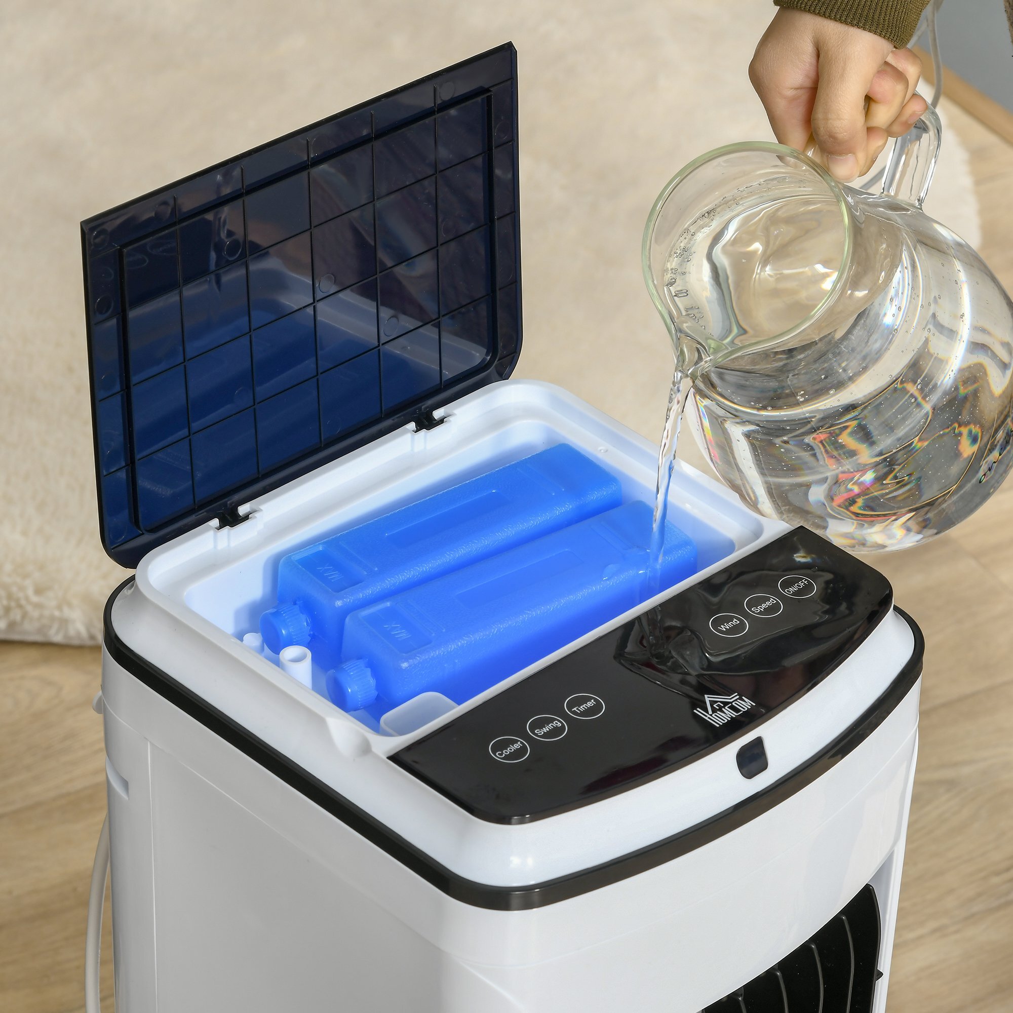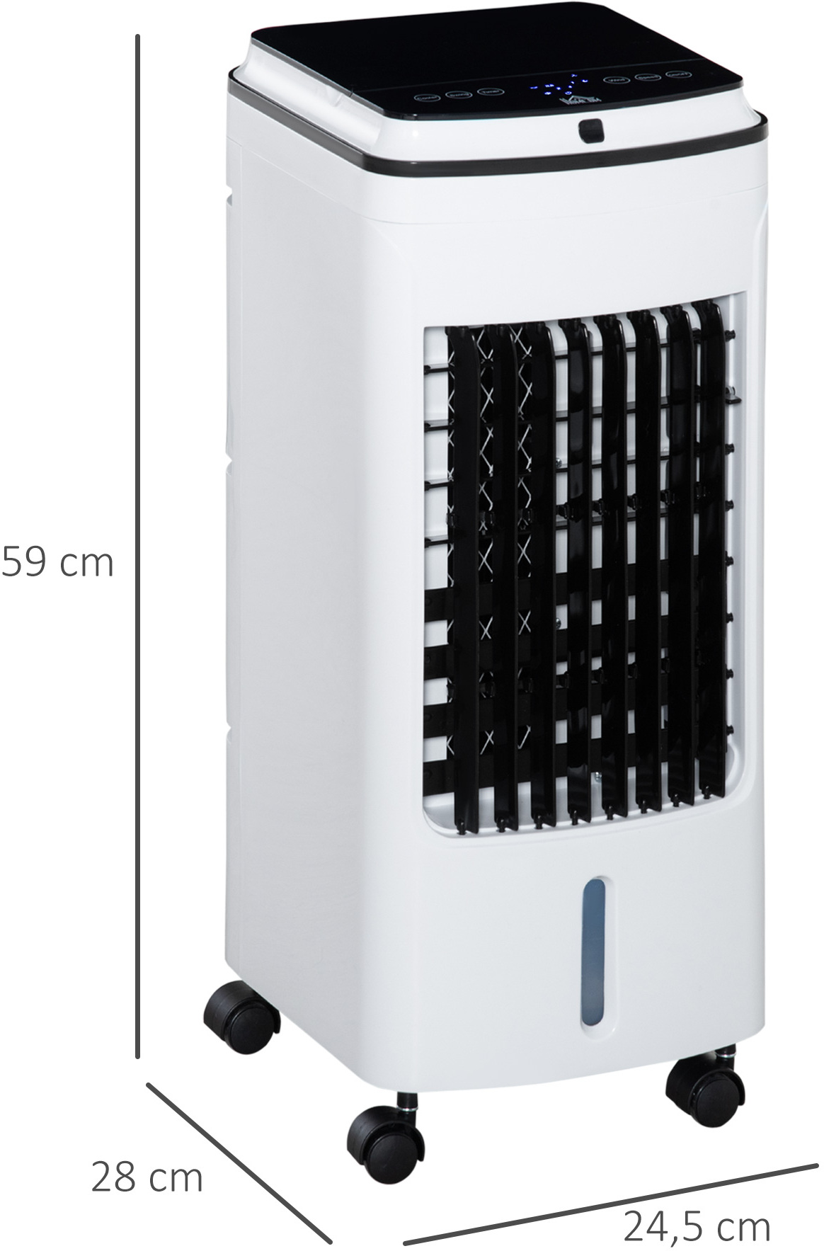 Refresca tu verano con este aire acondicionado de HOMCOM. Dispone de 3 velocidades y 3 modos de funcionamiento para satisfacer diferentes necesidades de uso. Además, tiene un temporizador de hasta 7,5 horas ¡y mando a distancia! Para que puedas configurarlo desde el sofá, aunque si lo prefieres también puedes hacerlo por la pantalla LED. Y lo mejor es que también tiene ruedas, para que puedas moverlo de una habitación a la otra. Características - Con 3 funciones: ventilador, refrigeración por hielo y humidificador - Tecnología exclusiva de refrigeración por hielo - Dispone de 3 modos de funcionamiento (normal, natural y noche) y 3 velocidades (alta, media y baja) - Función de oscilación para distribuir el aire en todos los rincones de forma uniforme - Temporizador de 7,5 horas con intervalos de 30 minutos para programar el funcionamiento - Pantalla LED con botones de encendido/apagado, velocidad, modo, oscilación, temporizador y enfriamiento con hielo - 2 modos de funcionamiento, a través de la pantalla táctil o mediante el control remoto incluido - Con 4 ruedas giratorias, 2 de ellas con freno para moverlo con facilidad - Depósito grande de agua para no tener que añadir agua constantemente - Requiere montaje Especificaciones - Color: blanco y negro - Material: ABS - Medidas totales: 24,5x28x59 cm (LxANxAL) - Volumen del depósito de agua: 4 litros - Longitud del cable de alimentación: 1,5 m - Área de cobertura: 15-25 m² - Voltaje: 220-240 V/50 HZ - Potencia: 75 W - Pilas del mando a distancia: 1 x CR2025 (incluida) - Certificaciones: UKCA+CE (LVD, ROHS, ERP y EMC) - Referencia: 824-036