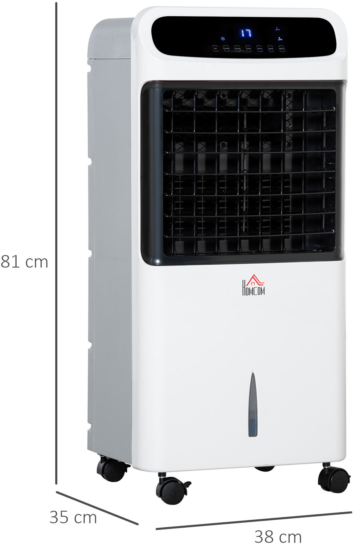 Refresca tu verano con este aire acondicionado de HOMCOM. Y no solo eso, ya que este aparato en realidad es un 4 en 1 que además de enfriar el aire de cualquier estancia, también tiene función de ventilador, ionizador y humidificador. Porque la calidad del aire es importante para nuestra salud en cualquier época del año. Además, tiene mando a distancia para que puedas programarlo tumbado en la cama o el sofá. Características - Con 4 funciones: ventilador, enfriador de aire, ionizador y humidificador - Tecnología exclusiva de refrigeración por hielo - Dispone de 3 modos de funcionamiento (normal, natural y noche) y 3 velocidades (alta, media y baja) - Función de oscilación de 60 grados para distribuir el aire en todos los rincones de forma uniforme - Temporizador de 12 horas con intervalos de 1 hora para programar según tus necesidades - Pantalla LED con botones de encendido/apagado, velocidad, modo, oscilación, temporizador, ionización y enfriador - 2 modos de funcionamiento, a través de la pantalla táctil o mediante el control remoto incluido - Con 4 ruedas giratorias, 2 de ellas con freno para moverlo con facilidad - Depósito grande de agua para no tener que añadir agua constantemente - Requiere montaje Especificaciones - Color: blanco - Material: ABS - Medidas totales: 38x35x81 cm (LxANxAL) - Volumen del depósito de agua: 12 litros - Longitud del cable de alimentación: 1,75 m - Rango de alcance del control remoto: 5 m - Área de cobertura: 25-35 m² - Voltaje: 220-240 V/50HZ - Potencia: 75 W - Pilas (control remoto): 1 x CR2025 (incluida) - Certificaciones: CE (EMC, LVD, ERP y ROHS) - Referencia: 824-041V90