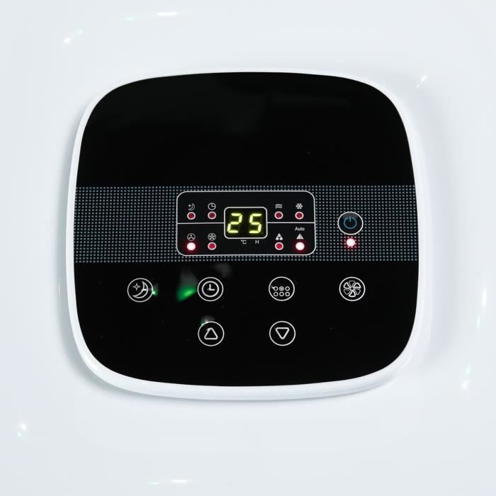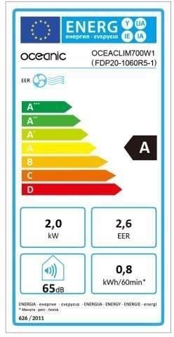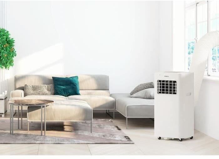 Aire acondicionado móvil OCEANIC - Capacidad de refrigeración: 2000 W (7000 BTU) - Funciones deshumidificador y ventilador - 2 velocidades - Superficie cubierta: 10 a 20 m² - Pantalla LED - Mando a distancia - Temporizador: 1-24 h - Caudal de aire: 250 m³ / h - Capacidad de deshumidificación: 19 L / d - Nivel sonoro: 65 dB - Clase energética: A - Blanco