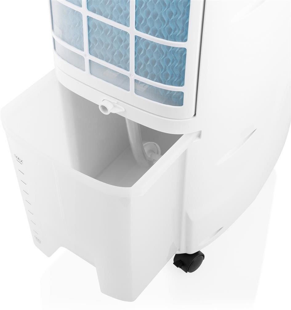 El climatizador AT-5465 de Tristar proporciona una brisa agradable durante los días de calor e incorpora ruedecillas para que pueda llevarlo donde más lo necesita. Despídase de esa sensación desagradable cuando el calor aprieta y disfrute de la brisa fresca. Este modelo consume poca energía y es apto para todo tipo de hogares.\n\nVarias posiciones\nEl climatizador tiene tres modos: normal, natural y sueño. Seleccione el modo natural y disfrute de un flujo de aire que cambia continuamente; se sentirá como si estuviera dando un paseo por la playa. El modo sueño reduce el nivel de ruido para que pueda dormir tranquilo y disfrutar de una agradable brisa fresca. Este modelo también le da la posibilidad de elegir la potencia de cada modo (900, 1100 o 1300 revoluciones por minuto) sin tener que preocuparse por el ruido gracias a los 60 vatios. Por último, el depósito de agua de 9 litros hará que pueda disfrutar del aire fresco durante mucho tiempo.\n\nFunción de temporizador\nEste climatizador de Tristar tiene una función de temporizador que va desde media hora hasta 7,5 horas. Así no tendrá que preocuparse por apagarlo. El climatizador también incluye un práctico mando a distancia para que no tenga que levantarse de la cama o el sofá.\n\nGrandes espacios bien climatizados\nLas ruedecillas del climatizador permiten llevarlo a cualquier habitación. Cambie el rango 60 grados hacia arriba o hacia abajo para aprovechar el climatizador al máximo.