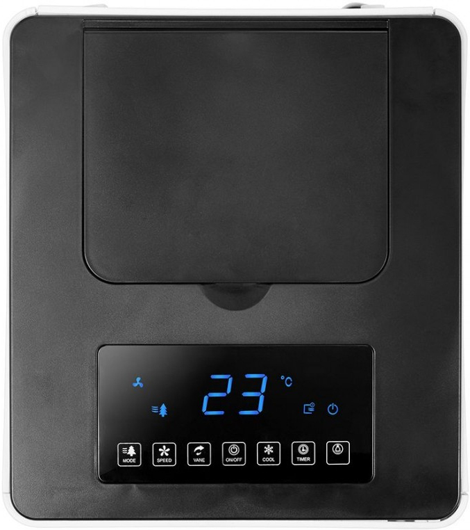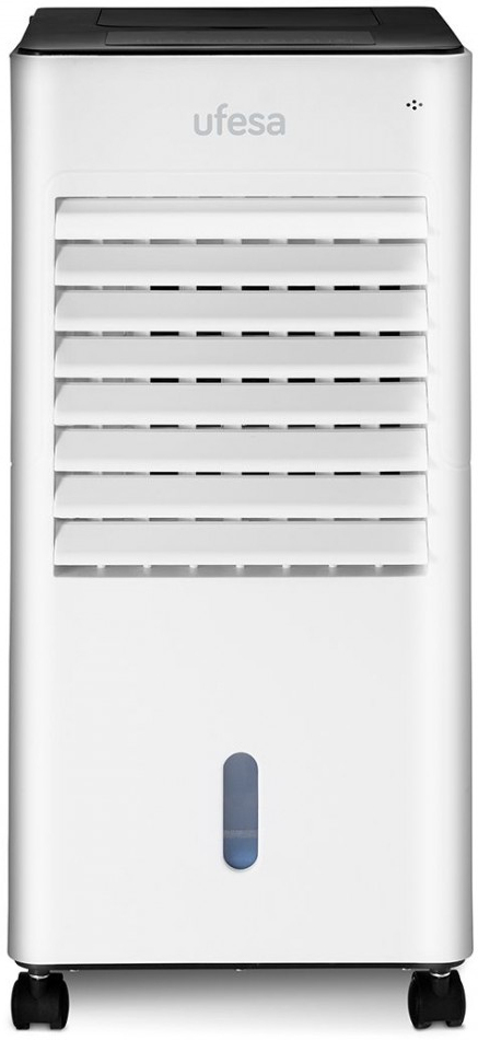 Enfriador de aire portátil, pantalla táctil, depósito de 5 L, temporizador de 12 h, 3 velocidades\n\nClimatizador evaporativo CL6040\n\n- Pantalla de control táctil Funciones: frío, ionizado, ventilación.\n- Posibilidad de llenado en la parte superior y en el depósito. Capacidad del depósito: 5 litros.\n- Temporizador de 12 horas. Temperatura de la habitación indicada en el panel de control.\n- 3 velocidades. Modo nocturno. Oscilación horizontal automática\n- 2 bloques de hielo. Ruedas de transporte.