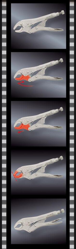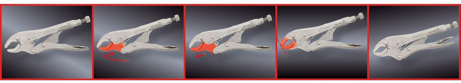 Mordazas de agarre forjadas Impide el resbalamiento incluso con fuerzas elevadas Estudiado dentado en las mordazas Ajuste de medida mediante rueda de ajuste Con palanca de liberación Con seguro de fijación Para material redondo y plano Para sujeción durante trabajos de soldadura Sin ensanchamiento ni siquiera con la máxima carga Palanca de liberación con presión constante por resorte Cromado Cromo-molibdeno