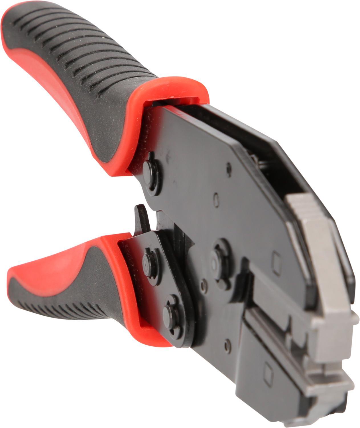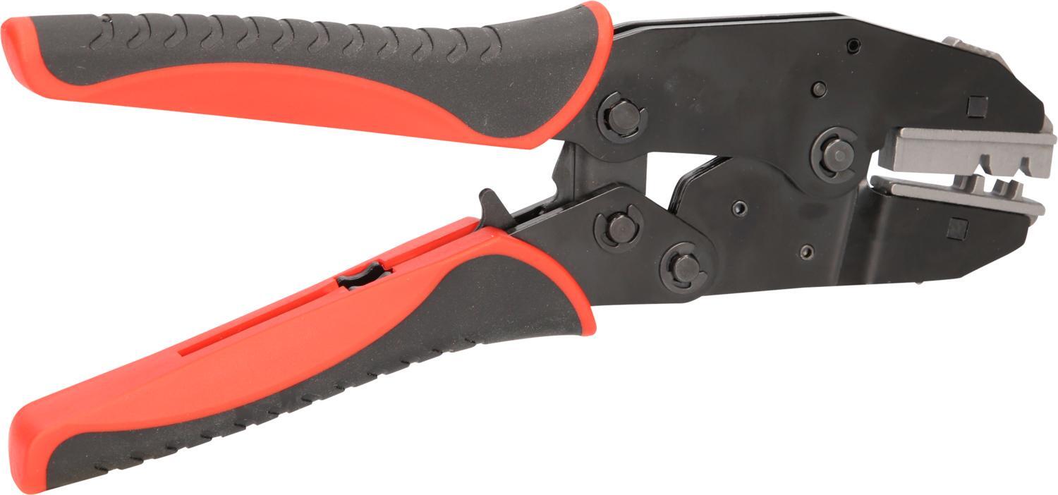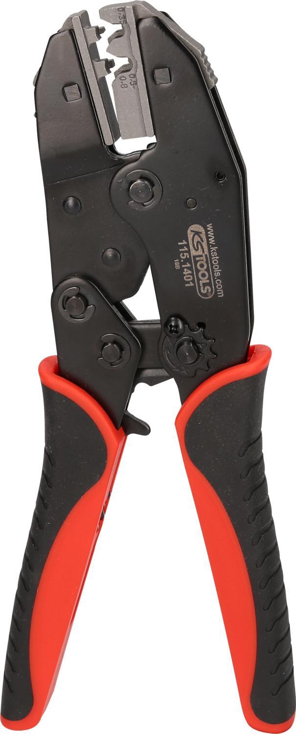 Gran robustez y fiabilidad Con rueda de trinquete Posibilidad de desbloqueo en caso de uso inadecuado Óptimo resultado de crimpado gracias a un perfil de precisión Con carraca Posibilidad de desplazamiento de la fuerza de presión Cambio sencillo de insertos de crimpado mediante mecanismo de cambio rápido Con mango de 2 componentes Acabado bruñido Cuerpo de alicates de acero plano