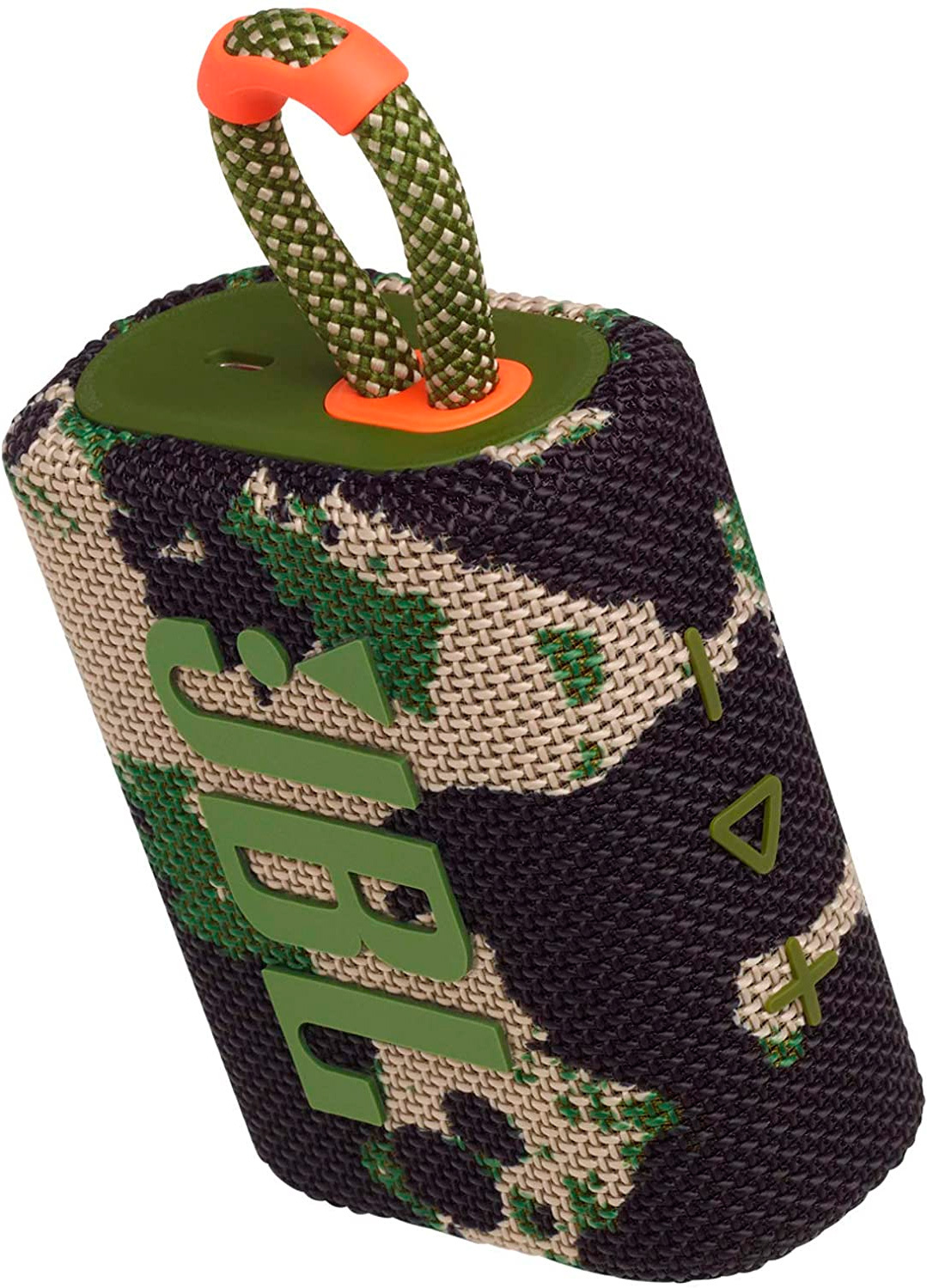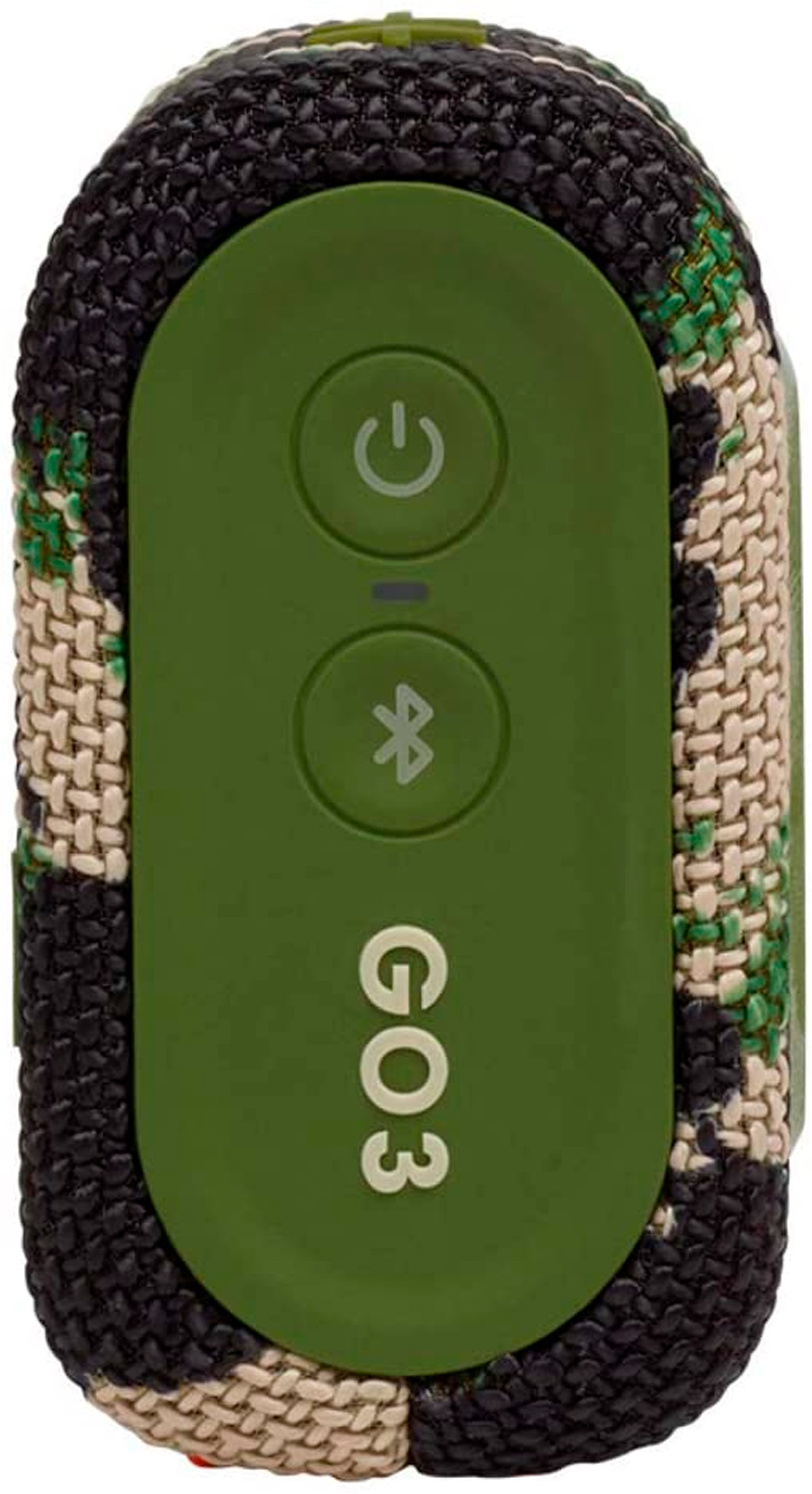 Altavoz inalámbrico portátil JBL GO3 con acabado en color camuflaje, 4.2W RMS de potencia de salida, conectividad inalámbrica Bluetooth 5.1, hasta 5 horas de reproducción, resistente al polvo y al agua IP67.