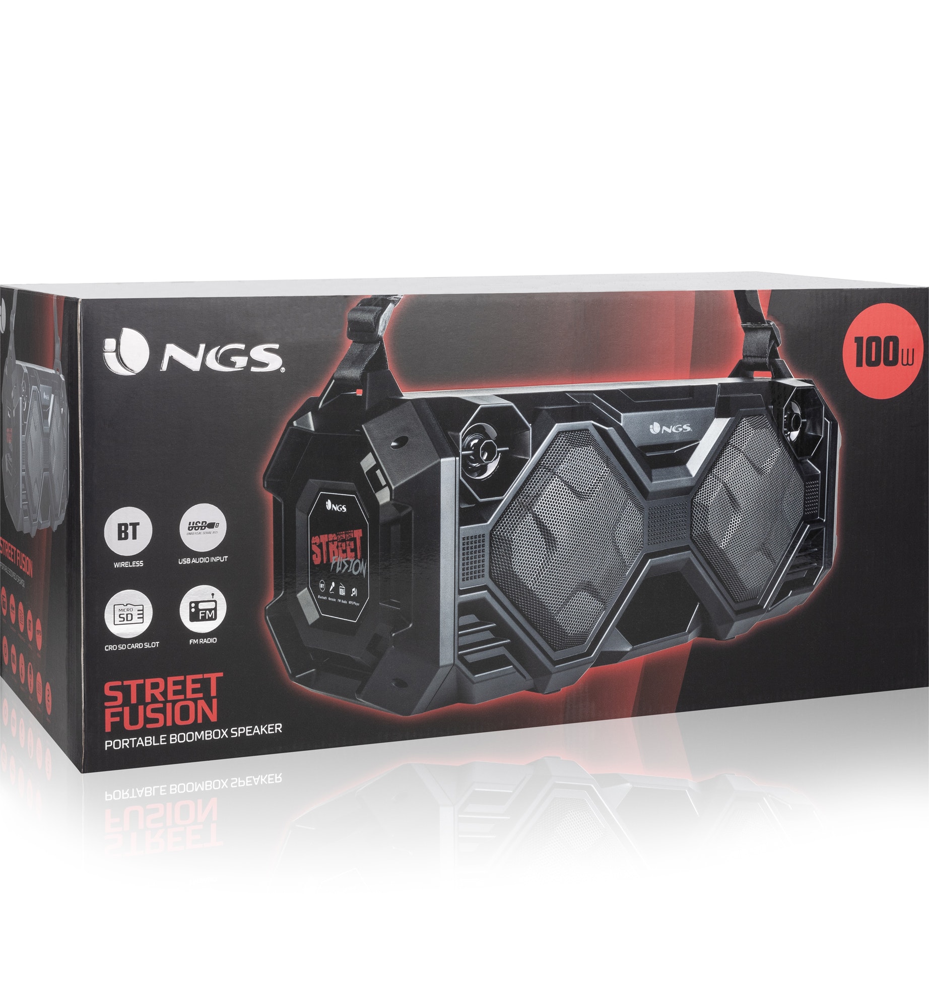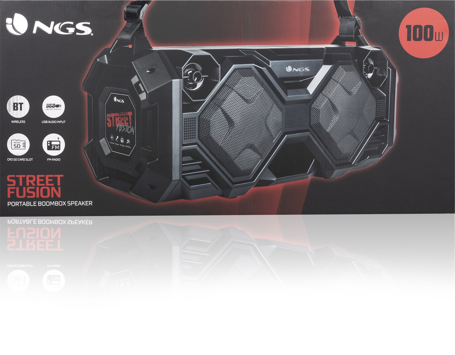 NGS Street Fusion. Potencia estimada RMS: 100 W, Rango de frecuencia: 70 - 20000 Hz. Tecnología de conectividad: Inalámbrico y alámbrico, Conector USB: USB tipo A. Color del producto: Negro, Control de volumen: Botones, Tipo de visualizador: LED. Uso recomendado: Universal, Tarjetas de memoria compatibles: MicroSD (TransFlash). Alimentación: Batería, Tipo de batería: Batería integrada, Tecnología de batería: Ión de litio