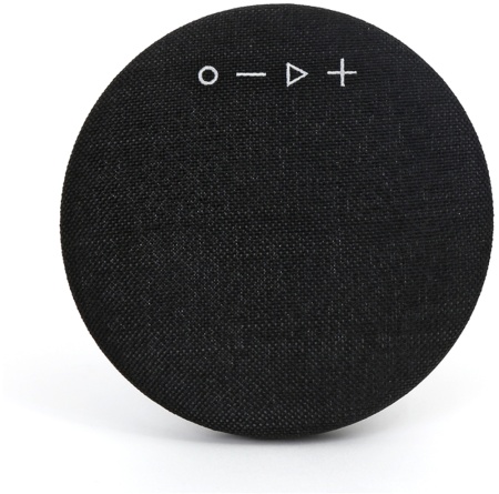 Altavoz inalámbrico de alta calidad con multiconectividad. Diseño plano slim, elegante, minimalista, con acabado frontal en tela. Botones de mando Bordados en Tela en el frontal, Reproducción, Pausa, Volumen…