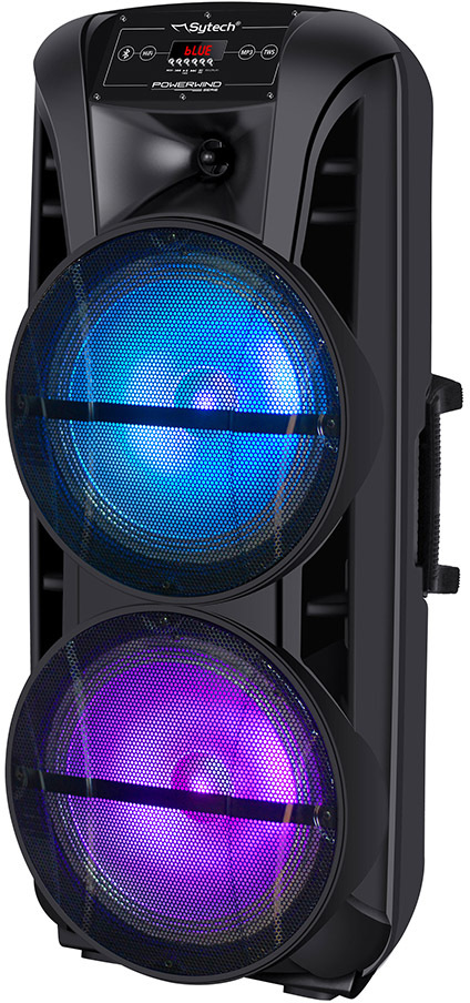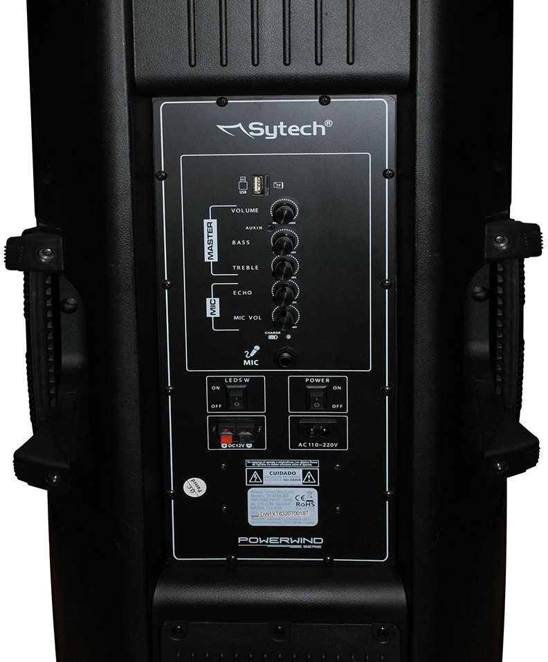 DESCRIPCIÓN: nSistema acústico profesional portátil inalámabrico serie ""Powerwind"". Alta potencia de salida: 300W. PMPO. Ideal para fiestas, clases de baile, eventos, karaoke... Acabado con materiales de gran resistencia. Tecnología Bluetooth para la transmisión inalámbrica desde un móvil, tablet. Función TWS que permite el emparejamiento de dos altavoces iguales para disfrutar de un sonido TRUE WIRELESS STEREO. Sintonizador FM con búsqueda automática. Entrada puerto USB 2.0 y ranura micro-SD. Pantalla LED con indicador de pista. Altavoces de 2 vías. Altavoces con luces LED integradas de 3 colores. Función de karaoke. Entrada auxiliar para conectar un dispositivo externo (DVD, CD, TV, MP3, Móvil.). Entrada de micrófono con control de volumen y eco. Accesorios incluidos: Mando a distancia, micrófono con cable, cable AC, cable audio, manual de instrucciones. CARACTERÍSTICAS TÉCNICAS: Potencia de salida PMPO: 300W. Potentia de salida RMS: 40W. Altavoces 2 vias: 2 x Woofer de 12"". Formatos de audio soportado: MP3, WAV. Versión Bluetooth: V5.0 + EDR. Perfil bluetooth soportado: A2DP, AVRCP. Maxima capacidad USB: 32GB. Maxima capacidad SD: 32GB. Respuesta de frecuencia: 35Hz-20Khz. SNR: 70dB ±3dB. Capacidad batería: 4500 mAh - 12V. Tiempo de funcionamiento: 2-4 horas (según el nivel del volumen). Tiempo de carga: aprox. 4-6 horas. Alimentación: 110-240V. 50/60Hz. Dimensiones: 38,5 x 92,5 x 36,0 cm. (Ancho/Alto/Fondo). Peso: 14,3 Kg.