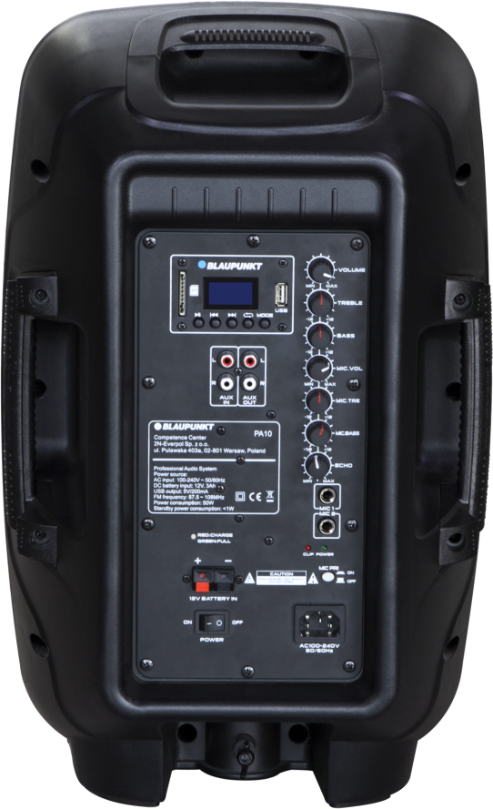 Blaupunkt Profesjonalny system audio PA10. Tipo de altavoces: De 1 vía, Ubicación de altavoz: Funda para PC. Potencia estimada RMS: 600 W. Color del producto: Negro. Alimentación: Corriente alterna, Batería, Voltaje de la pila: 12 V. Ancho: 319 mm, Profundidad: 362 mm, Altura: 495 mm