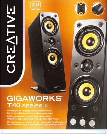 Creative Labs GigaWorks T40 Series II. Uso recomendado: PC, Canales de salida de audio: 2.0 canales. Potencia estimada RMS: 32 W, Rango de frecuencia: 50 - 20000 Hz. Color del producto: Negro