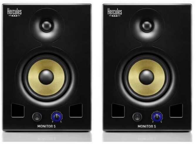 HERCULES Monitor 5 - 2 altavoces de 80W RMS - 160W de potencia máxima - Biamplificador: 50W de baja frecuencia y 30W de alta frecuencia - Woofer de 5 en material compuesto de Kevlar - Guía de ondas acústicas mejorada - El interruptor de encendido/apagado se detiene fácilmente - Son ideales para practicando la mezcla"