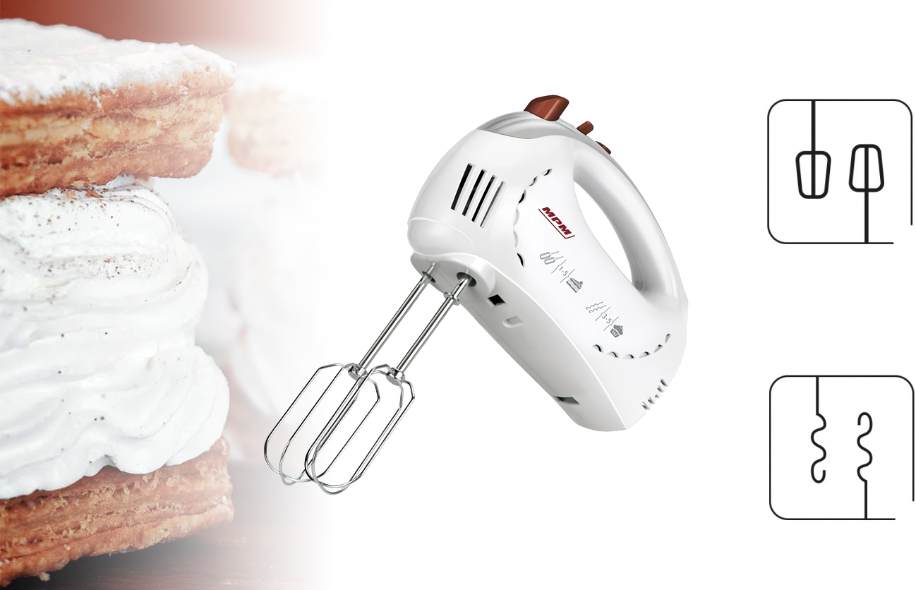 La batidora manual MMR-15 es un dispositivo indispensable en cualquier cocina. La potencia del motor, 300 W, le permite trabajar larga y eficientemente a máxima velocidad. Con la amasadora de MPM puedes preparar fácilmente postres simples o más elegantes.El mezclador de mano MMR-15 está equipado con un control de velocidad de 5 etapas y una función Turbo, que le permite trabajar a máxima velocidad en poco tiempo. El uso seguro del mezclador MMR-15 está garantizado por un sistema que hace imposible retirar los mezcladores mientras se trabaja. Solo se pueden quitar después de usar el botón que libera los accesorios. CARACTERÍSTICAS300 W / 5 velocidades / 2 juegos de mezcladores300 W de potencia2 juegos de mezcladoresSeguridad5 velocidades + TurboAmasadora de Mano5 VelocidadesEl mezclador MMR-15 está equipado con un control de velocidad de 5 etapas y una función Turbo, que permite una velocidad máxima en poco tiempo.2 juegos de mezcladoresEn el set con la mezcladora MMR-15 encontrarás mezcladoras para batir espuma y masa ligera y mezcladoras de gancho para masas más pesadas.Protección El uso seguro del mezclador MMR-15 está garantizado por un sistema que hace imposible retirar los mezcladores mientras se trabaja. Solo se pueden quitar después de usar los accesorios de liberación del botón.
