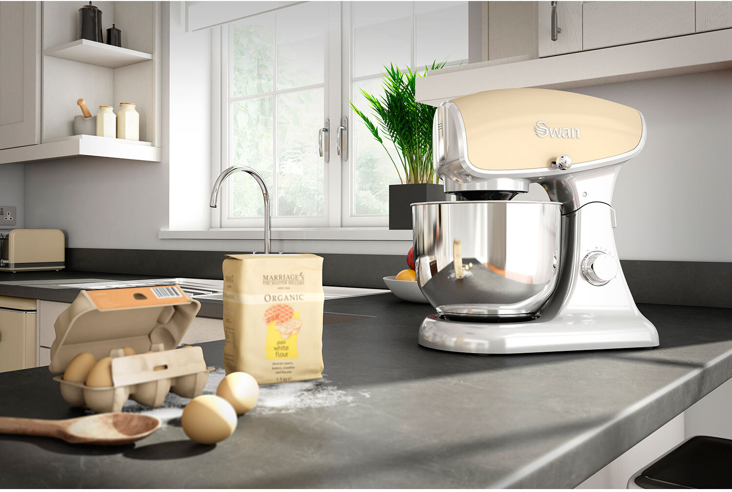 Con 8 velocidades intercambiables, la amasadora vintage estilo retro de Swan te facilitará tus recetas de repostaría: Pasteles, galletas, hojaldres y mucho más en tu propia cocina.El diseño de esta amasadora está inspirado en un estilo vintage, que hace juego con toda la gama retro de swan, en la cual podrás escoger el color que más te guste y que más acorde vaya con la decoración de la cocina.El movimiento de rotación planetaria junto a sus 1200W de potencia permiten que la mezcla de la masa quede de una manera homogénea de una forma fácil y rápida. Es ideal para un sin fin de recetasCARACTERÍSTICAS1200W / Movimiento Planetario / 8 Velocidades/ Bowl de Acero InoxidableBatidora amasadora Retro con un apotencia de 1200 vatios máx.Cuerpo Robusto de Metal con estilo Vintage disponible en diferentes colores .Control electrónico de velocidad continuo, para dar una potencia constante e independientemente de la mezcla a preparar.Control de velocidad electrónico de 8 velocidades .Bowl de acero fino de 4,5 litros para preparar mezclas.Sistema de mezcla planetario.Mecanismo de engranaje especialmente robusto.Brazo basculante con la posibilidad de acoplar distintos accesorios.Posibilidad de acoplar más accesorios no incluidos y venta por separado (Picadora Carne y Cortador de Verduras).Tapa para la protección contra salpicaduras con orificio de llenado.Fácil de utilizar y limpiar.Base antideslizante con ventosas.Incluye un bol de acero inoxidable y 3 accesorios de mezcla: Gancho especial masas pesadas, Gancho agitador especial pastas y Batidor de Varillas.Especificaciones TécnicasAlimentación: AC 230 50/60 HzPotencia: 1200WDimensiones: 37,2 x 20 x 36,7 CmAmasadora perfecta para reposterosAccesorios incluidos para diferentes métodosGran Bolw de Aluminio de 4,5 Litros,válido para lavavajillas8 velocidades y sistema Inicio suave, que evita salpicaduras