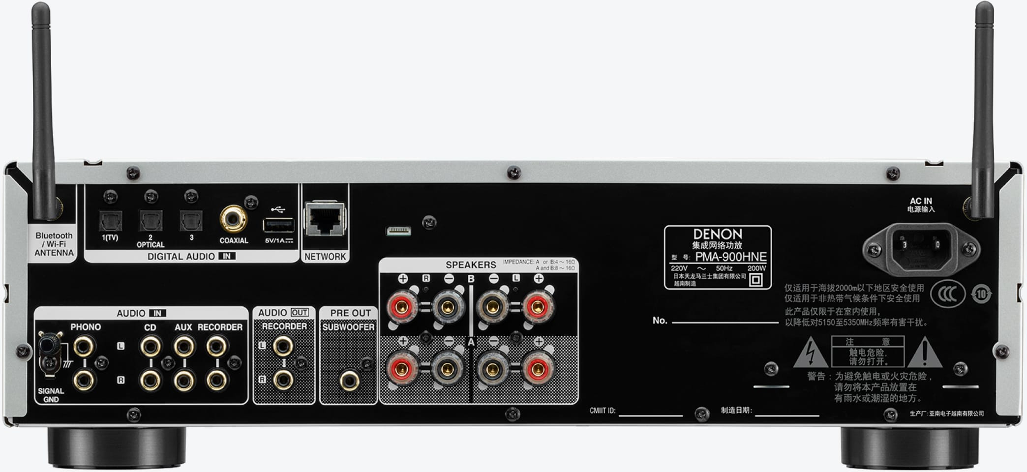 Denon PMA-900HNE. THD, distorción armónica total: 0,01%, Relación señal/ruido (SNR): 105 dB, Salida de potencia RMS por canal (4 Ohmios): 85 W. Tipo de conectividad de bocina: RCA, Tipo de puerto USB: USB tipo A. Consumo energético: 200 W, Consumo de energía (inactivo): 0,2 W. Ancho: 434 mm, Profundidad: 376 mm, Altura: 131 mm. Ancho del paquete: 518 mm, Profundidad del paquete: 385 mm, Altura del paquete: 209 mm