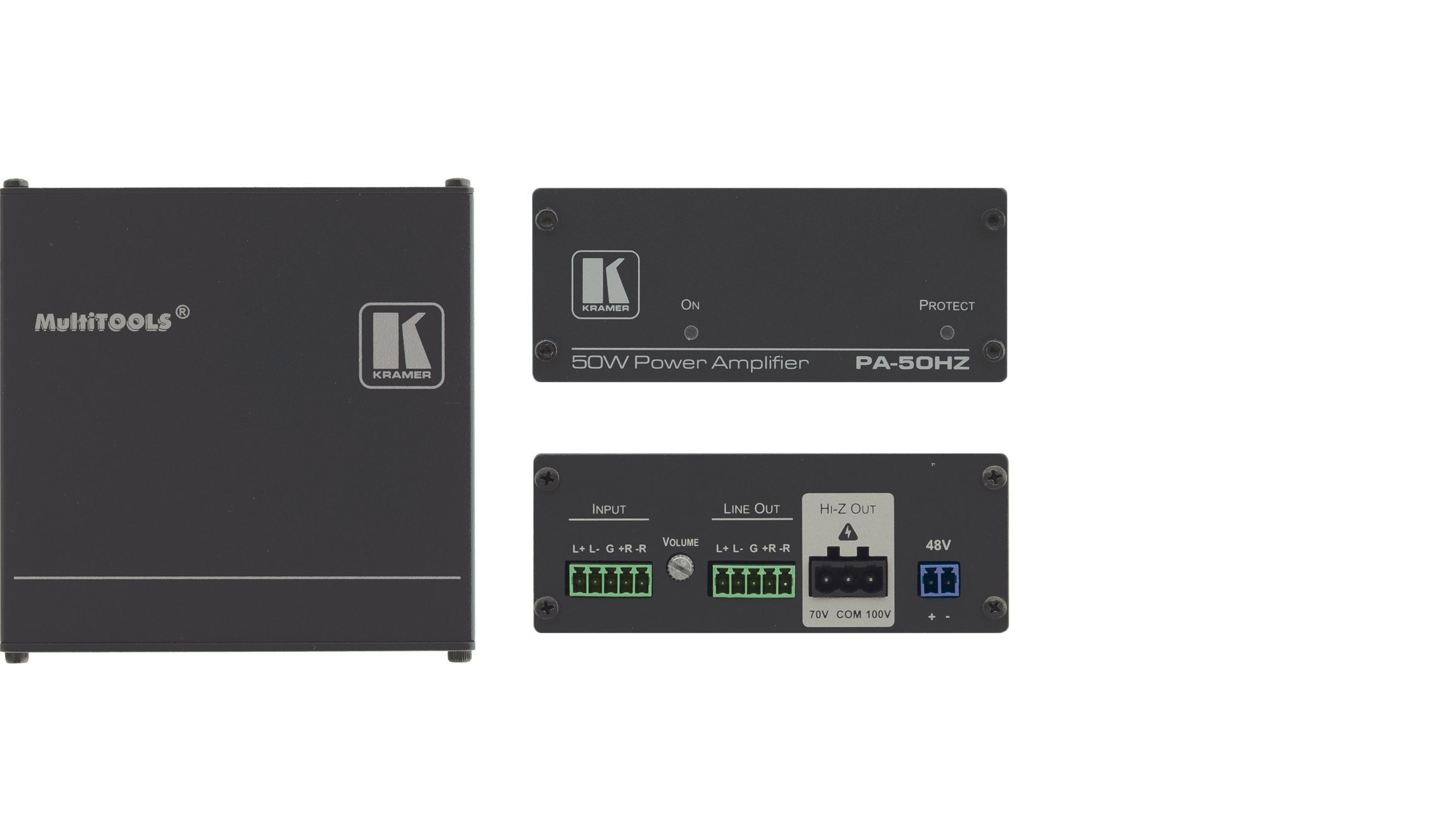 Kramer Electronics PA-50HZ. Canales de salida de audio: 1.0 canales, Potencia pico por canal: 50 W, Amplificador de clase: D. Tipo de conectividad de bocina: Euroblock. Voltaje de entrada DC: 48 V, Máxima corriente: 1,36 A. Ancho: 106,8 mm, Profundidad: 103,5 mm, Altura: 43,6 mm. Certificación: CE, UL, WEEE