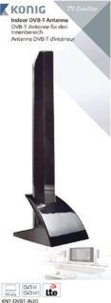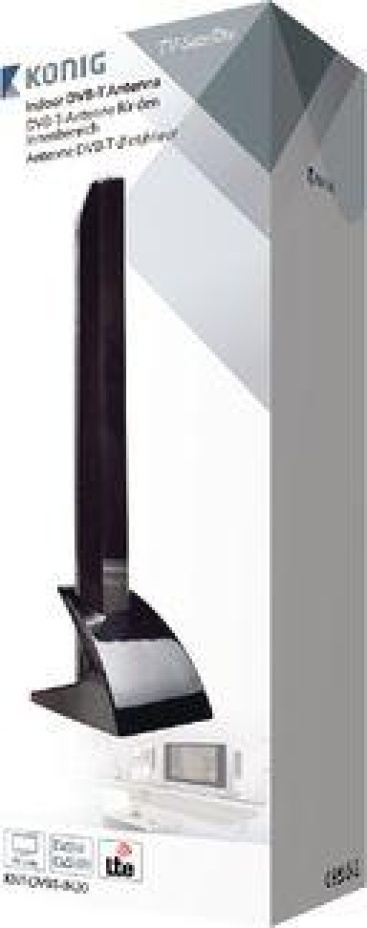 König KNT-DVBT-IN20. Ubicación: Interior, Color del producto: Negro, Longitud del cable de antena: 1,8 m. Voltaje de entrada DC: 5 V. Ancho del paquete: 78 mm, Profundidad del paquete: 101 mm, Altura del paquete: 267 mm