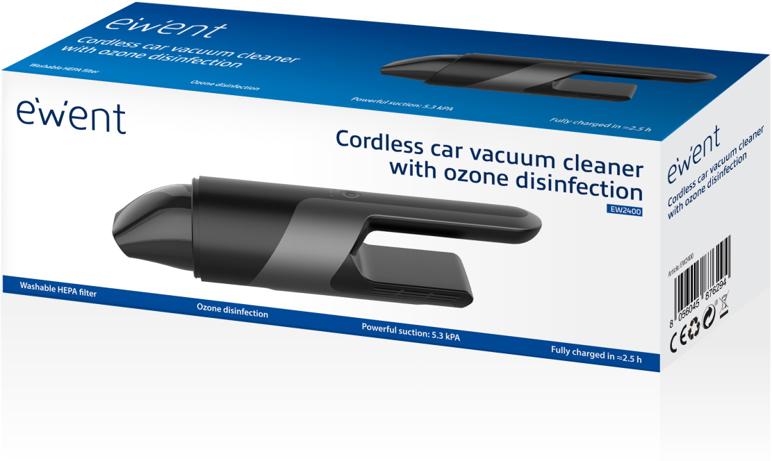 El aspirador purificador inalámbrico 2 en 1 Ewent EW2400 es un potente aspirador de 5300 Pa con purificador de aire con ozono y desinfección. Dispone de un filtro HEPA lavable y totalmente reutilizable. Una vez que se desactiva la aspiradora, la suciedad que ha sido aspirada permanecerá dentro del depósito.\n\nEl aspirador de mano inalámbrico Ewent dispone de 3 boquillas de succión. Incluye una boquilla de succión normal con depósito, una boquilla para las esquinas y una boquilla con cepillo.\n\n“El aspirador portátil EW2400 tiene un generador de ozono que permite la desinfección y esterilización del ambiente. Destruye gérmenes y purifica el ambiente. La aspiradora es útil para ambientes donde hay personas con alergias (polvo y polen), ya que el efecto del ozono reduce la concentración de estas partículas ”.\n\nLa aspiradora de mano inalámbrica EW2400 tiene una batería de 2500 mAh. El tiempo de uso puede alcanzar los 20 minutos a pleno rendimiento. Su tecnología de carga rápida tarda solo 2,5 horas en cargarse por completo. Cargue la aspiradora a través de USB conectándola a un cargador de pared USB o un cargador de coche USB de al menos 2,1 A.