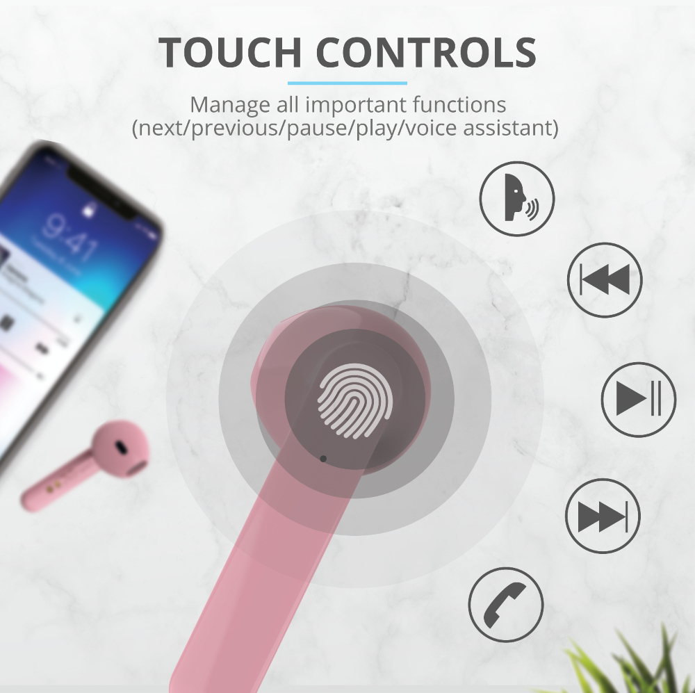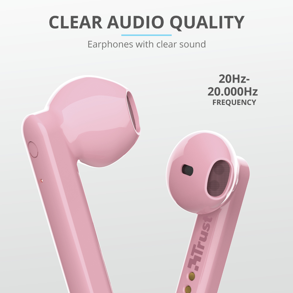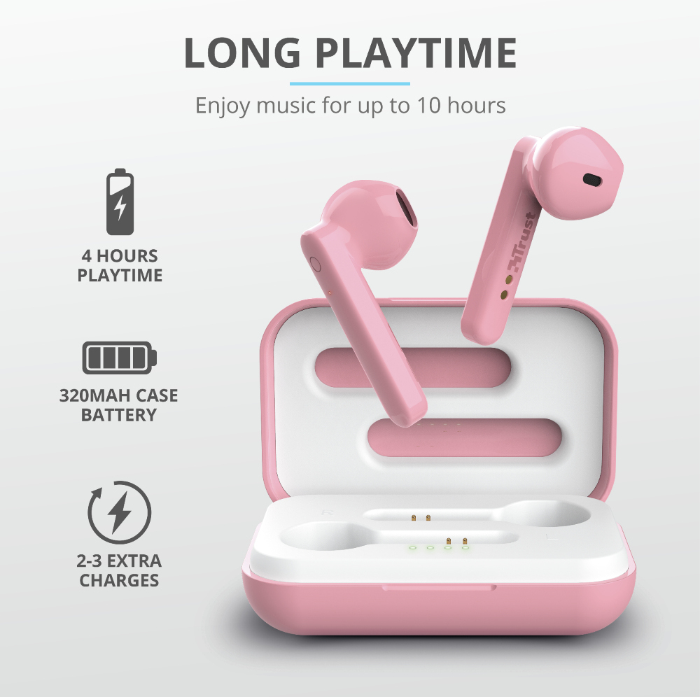 Muévete con libertad y estilo\nLos auriculares inalámbricos Primo Touch de Trust ofrecen libertad de movimiento con un alcance inalámbrico extralargo y funciones para cargarlos en cualquier lugar. Y, gracias a su diseño, no solo te moverás con libertad, sino también con estilo.\n\nPoder inalámbrico\nCon un alcance inalámbrico de 10 metros, los auriculares son compatibles incluso cuando estás lejos del dispositivo. Muévete libremente por la habitación mientras el teléfono se está cargando sin tener que poner en pausa la música.\n\nCárgalos en cualquier sitio\nLos auriculares Primo tienen un tiempo de reproducción de hasta 4 horas con una sola carga, pero la música no se detiene allí. El estuche incluido no sirve solo para transportar los auriculares; también funciona como cargador sobre la marcha. Solo tienes que colocar los auriculares en su interior y comenzarán a cargarse, dando como resultado un tiempo de reproducción total de hasta 10 horas.\n\nDiseño moderno\nCon su diseño minimalista de vanguardia, los auriculares combinan un sonido excelente con una imagen fantástica. Gracias a sus cápsulas con un cómodo ajuste, disfrutarás de unos auriculares que se mantienen en su sitio y ofrecen comodidad durante todo el día, a la vez que te mantienen alerta de sonidos cercanos.\n\nEl toque mágico\nCon los controles táctiles supraaurales, se accede a las funciones más importantes, como reproducir, pausar y saltar canciones sin tener que manipular el dispositivo. El micrófono integrado también permite acceder rápidamente al asistente de voz del smartphone para realizar llamadas de manos libres.