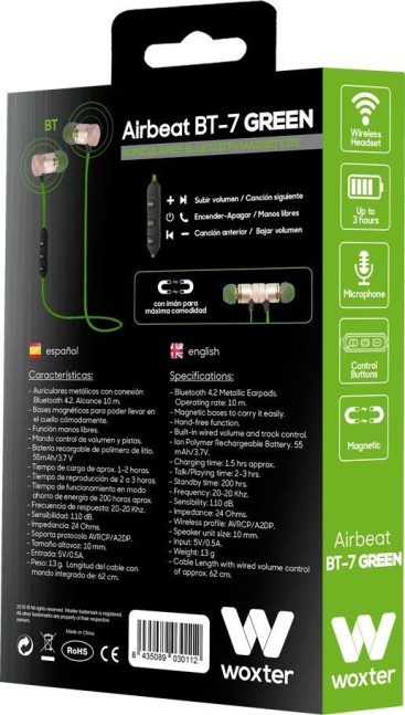 Auriculares estéreos Bluetooth magnéticos Woxter Airbeat BT-7 Green.\n\nSi eres de l@s que escuchan música mientras corres y entrenas, estos auriculares Bluetooth magnéticos serán tu mejor aliado. Con su diseño in-ear, conexión Bluetooth, imanes entre los cascos para que te los cuelgues sin problema y su batería de polímeros de Litio serán tu compañero ideal en el día a día.\n\nAuriculares Bluetooth magnéticos, elegantes y modernos. Incorporan unos prácticos imanes para que cuando no estén en uso, puedas ponerlos alrededor del cuello sin que te estorben o se caigan.