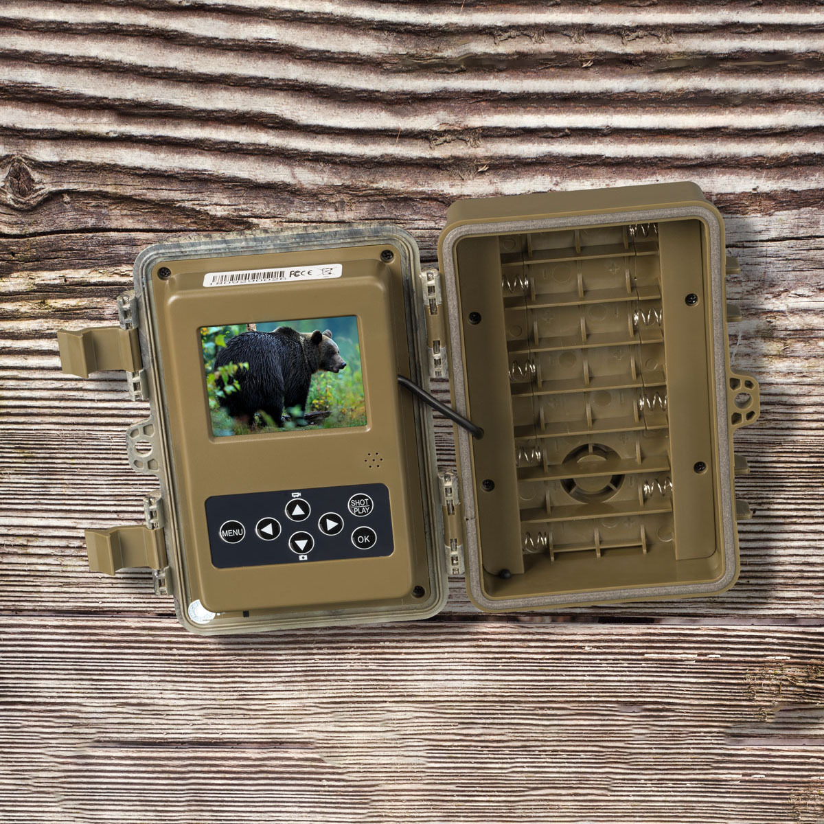 Pasa desapercibida gracias a su diseño de camuflaje y equipada con una iluminación LED infrarroja, esta cámara digital se puede utilizar tanto para la protección de objetos como para obtener impresionantes planos de los seres vivos de la naturaleza. La cámara tiene un sensor de movimiento, con un alcance de aprox. 20 m, que dispara automáticamente la cámara de observación de vida salvaje en cuanto detecta el más mínimo movimiento. Además, gracias a su carcasa impermeable es adecuada para todas las estaciones del año. Con esta cámara no solo se pueden tomar fotografías. También permite capturas de vídeo, cuya duración se puede seleccionar entre 10, 20, 30 segundos o 1 minuto. La cámara se puede usar de día (imágenes en color) y, gracias a la iluminación infrarroja, también durante la noche (en blanco y negro). Su bajo consumo de corriente garantiza un uso prolongado sin tener que cambiar las pilas constantemente.