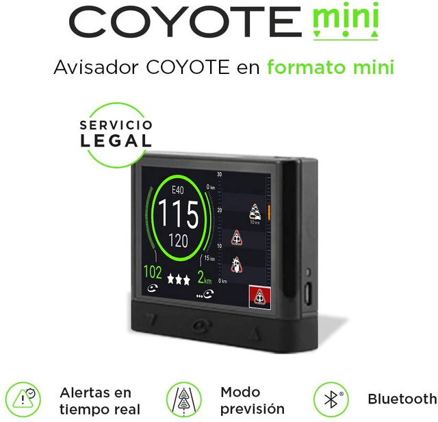 Dipositivo Lega. Permitido en la nueva ley de tráfico de la DGT (lo que está prohibido son los “detectores de radar” y Coyote funciona como un “avisador de radar” y su base de datos proviene de fuentes oficiales como la propia DGT, entre otras). La tecnología COYOTE está respaldada por 13 patentes europeas. Requiere suscriopción mensual o anual.
