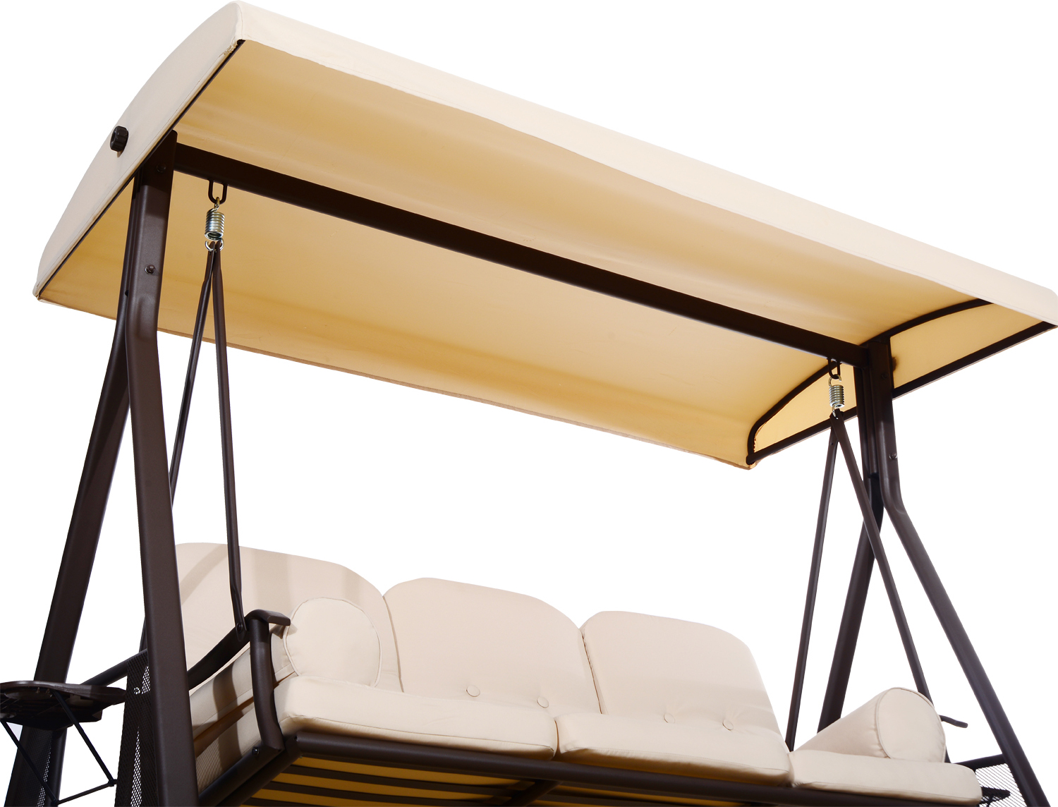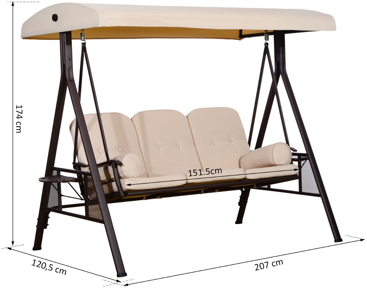 ¿Necesitas darle un toque de comodidad y elegancia a tu jardín o terraza? Este columpio balancín de 3 plazas dispone de parasol y es ideal para decorar cualquier espacio exterior. Está hecho de tubo de acero resistente y tela de poliéster. Ofrece 3 asientos amplios y cómodos para poder disfrutar del tiempo libre con fu familia. Nuestros balancines tienen bandejas laterales para colocar bebidas y refrescos. Es ideal para hacer el vermut. En la parte superior dispone de un techo para protegerse del sol. ¡Este columpio balancín es un elemento indispensable poder disfrutar del buen tiempo en tu jardín o terraza! Características - Estructura de tubo de metal y tela de poliéster de alta calidad y estabilidad - Ofrece 3 asientos amplios y cómodos - Apto para el jardín, parque, patio, terraza, patio o cualquier espacio exterior - Cojín relleno de algodón suave para obtener la máxima comodidad - Tela de poliéster de 220 g/? con recubrimiento PA - Bandejas a los 2 lados para colocar bebidas - Parasol impermeable en forma de arco para proteger del sol y la lluvia - Montaje fácil y rápido -Nota sobre el envío- Debido a su tamaño, este producto se envía en 2 o más cajas. Por motivos logísticos, es posible que no reciba todos los bultos al mismo momento. Especificaciones - Color: Beige - Material: Tubo de metal, tela de poliéster - Dimensiones totales: 207x120.5x174cm (LxANxAL) - Dimensiones del asiento: 151.5x51.5cm (LxAN) - Espesor del cojín: 8cm - Dimensiones del paquete1: 154x58x25cm (LxANxAL) - Dimensiones del paquete2: 198x32x8cm (LxANxAL) - Peso bruto: 44 kg - Peso neto: 40 kg - Capacidad máx. de carga: 360 kg - Referencia: 84A-068 - Este producto viene con 2 paquetes.