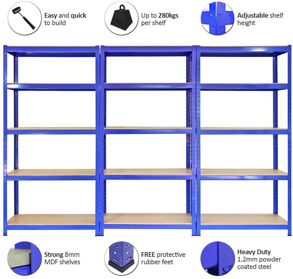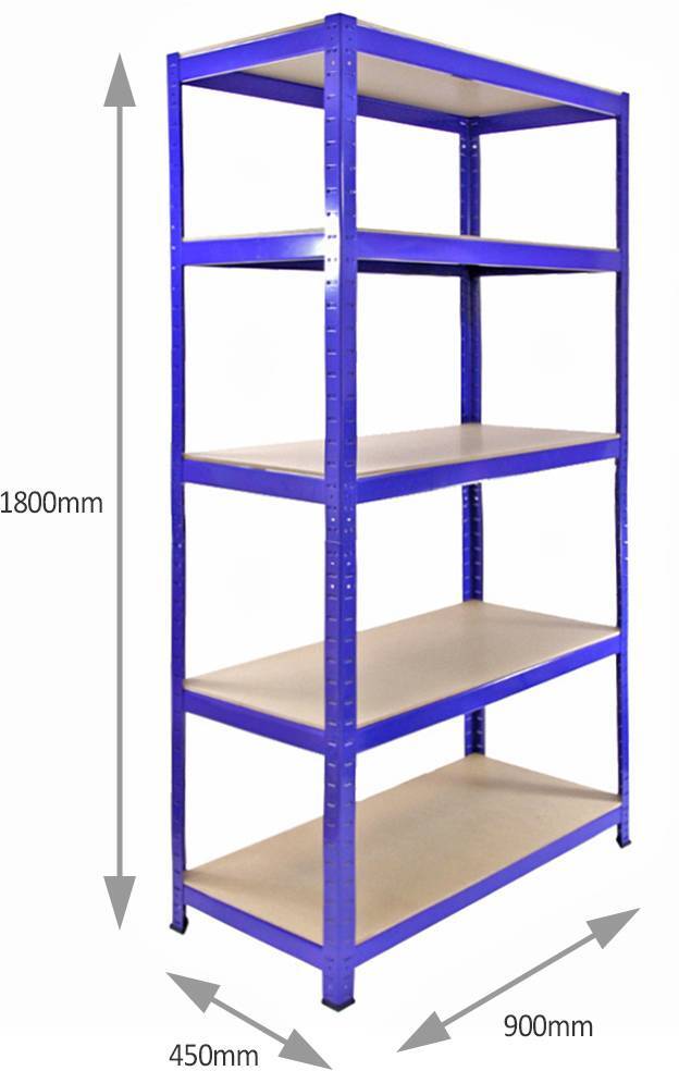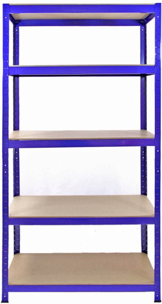 Organiza el espacio de tu garaje con las estanterías para garaje y almacén de nuestra gama T-Rax..100% sin tornillos, 280kg de capacitad y mide 90cm (anchura) x 45cm (profundidad) x 180cm (altura)..Características:.• 1 x estantería para almacén/garaje de nuestra gama Q-Rax con cinco estantes..• Puede ser separada para crear dos mesas de trabajo..• Sólidos tablones de MDF para todos los estantes..• Pies que garantizan estabilidad extra..• Tolerancia de peso de 280kg por estante si el peso es uniformemente distribuido..• Acero resistente (cada estantería pesa más de 35kg)..Para montar esta estantería todo lo que necesitas es, ¡una maza de goma!.Ojea nuestra tienda en eBay para ver otras estanterías para garaje / almacén / deposito..Artículos relacionados: 6x conectores para Estanterías.