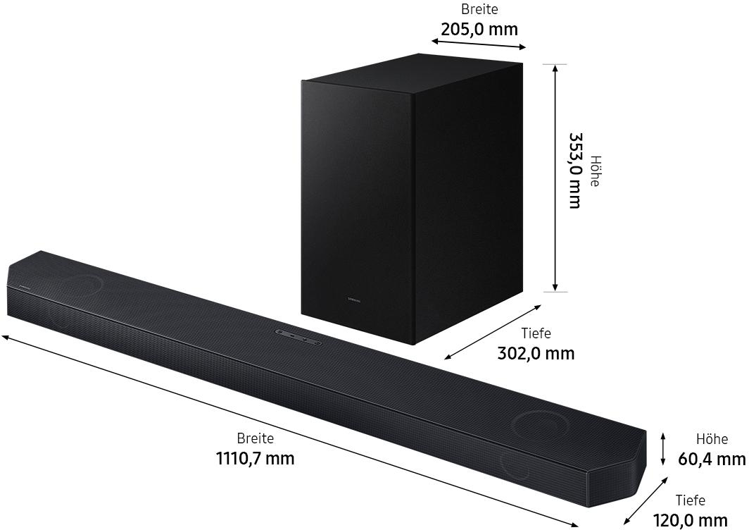 Samsung HW-Q710GC. Canales de salida de audio: 3.1.2 canales, Potencia estimada RMS: 320 W, Decodificadores incorporados: DTS:X, Dolby Atmos, Dolby Digital Plus, Dolby TrueHD. Conectividad del altavoz de subgraves (subwoofer): Inalámbrico, Potencia RMS de subwoofer: 160 W, Ubicación del altavoz de graves: Separar. Color del producto: Negro, Tecnología HDR (High Dynamic Range, Alto rango dinámico): High Dynamic Range 10+ (HDR10 Plus), Formatos de audio soportados: AAC, AIFF, ALAC, FLAC, LPCM, MP3, OGG, WAV, WMA. Tecnología de conectividad: Inalámbrico y alámbrico, Códec de audio para Bluetooth: SBC, Frecuencia Wi-Fi: 5 GHz. Consumo eléctrico de la barra de sonido: 37 W, Consumo de energía del altavoz potenciador de graves: 28 W, Consumo energético: 65 W