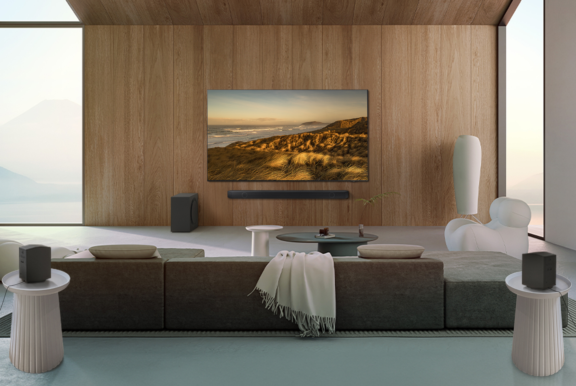 Wireless Dolby Atmos\nSin necesidad de cables\nUn sonido envolvente gracias al primer Dolby Atmos© inalámbrico del mundo.\n\nTrue 11.1.4ch Sound\n¡22 altavoces!\nLa mejor calidad de sonido con Dolby Atmos© gracias a sus 11 canales, 1 subwoofer que potencia los graves y 4 canales superiores.\n\nQ-Symphony\nUn sonido en perfecta armonía con tu TV\nCombina y mejora el sonido del TV con una barra de sonido y disfruta de todo el contenido como nunca antes.\n\nSpaceFit Sound Pro\nSe adapta a tu entorno\nMejora tu experiencia de sonido gracias a los sensores de la barra que analizan el entorno, para ajustar los parámetros de audio.\n\n¿Por qué esta barra de sonido es tan inmersiva?\nHa sido diseñada para proporcionarte el máximo nivel de inmersión. Para ello, combina estratégicamente tres tipos de altavoces: frontales, laterales y superiores o up-firing.\n\nAltavoces traseros up-firing incluidos\nSonido de cine con audio de proyección superior\nLos altavoces inalámbricos traseros up-firing hacen que el sonido se proyecte sobre ti tras reflejarse en el techo, creando así una sensación envolvente de audio para brindarte en casa una experiencia a la altura de una sala de cine auténtica.\n\nSonido trasero silencioso\nDisfruta la televisión solo con los altavoces traseros\nAhora puedes ver la televisión sin molestar a nadie. Activa solo los altavoces traseros y el volumen bajará notablemente sin que te pierdas nada.\n\nSonido conjunto\nReproducción en grupo con altavoces traseros para que tu música lo llene todo\nSincroniza los altavoces traseros con la barra de sonido principal para acompañar el audio y conseguir que tu música llene la habitación y el ritmo llegue a cada rincón.\n\nAdaptive Sound\nSonido optimizado para cada escena\nAdaptive Sound optimiza el sonido específicamente para cada contenido de audio. Así, en función del contenido y el volumen, las voces se perciben más claras y los sonidos más detallados.\n\nActive Voice Amplifier (AVA)\nEscucha cada palabra sin distracciones\nEscucha los diálogos de forma clara aunque haya distracciones a tu alrededor. Active Voice Amplifier aumenta el volumen de las voces y las adapta a niveles de ruido cambiantes para que no te pierdas nada.\n\nSamsung Audio Lab\nCalibrada por expertos en innovación de audio\nEsta barra de sonido ha sido testada y calibrada en el laboratorio de sonido de California por expertos en ingeniería de sonido, que aplican tecnologías de audio avanzadas para crear un efecto envolvente y equilibrado.\n\nHDMI 2.1 / HDMI eARC\nSonido de calidad a tu alcance\nLa compatibilidad con las tecnologías HDMI eARC y HDMI 2.1 pone el sonido más avanzado a tu alcance. Puedes conectar videoconsolas o reproductores UBD a tu barra de sonido a través de tu televisor para disfrutar al máximo los formatos de audio envolvente 3D, como Dolby Atmos.\n\nAsistente de voz y servicios de streaming\nPon tu música favorita y contrólala con tu voz\nControla por voz tu barra de sonido utilizando la funcionalidad de