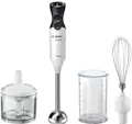 Batidora de brazo, 800W, Selector de velocidad con 12 posiciones, Pulsador turbo, Tecnología 'QuattroBlade': con cuatro cuchillas, Funcionamiento silencioso, Diseño ergonómico, empuñadura SoftTouch y grandes botones, Pie desmontable mediante pulsadores, Fácil limpieza, Todas las piezas plásticas en contacto con los alimentos están libres de BPA, Picador, Varilla batidora de acero inoxidable, Vaso medidor transparente para mezclas, Incluye tapa..BATIDORA BOSCH MS6CA4150