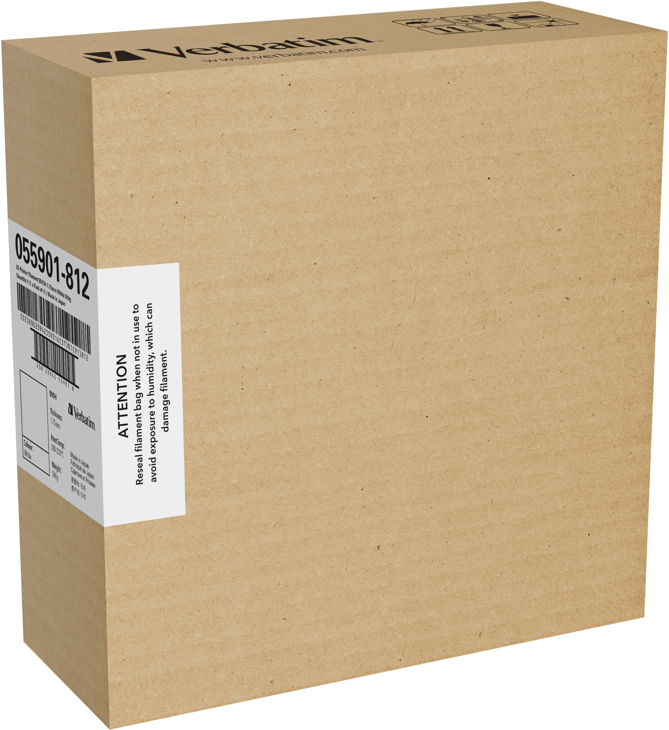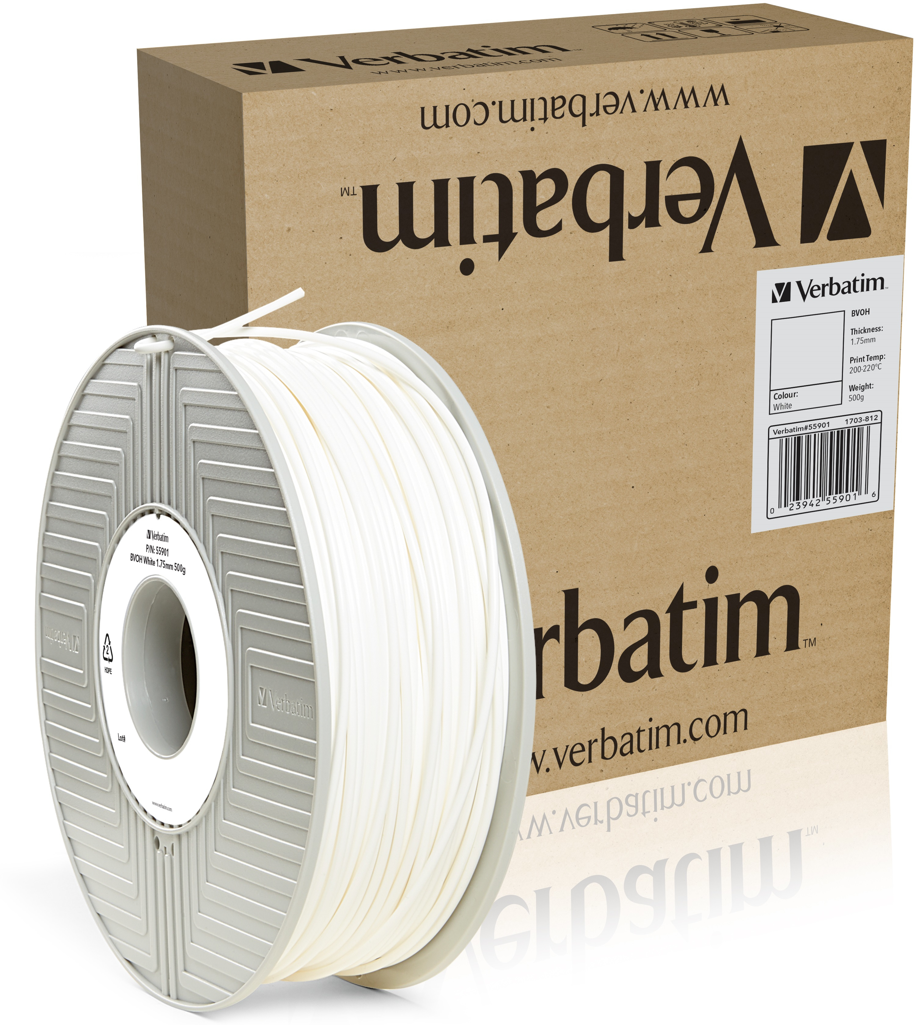 Verbatim 55901. Materiales de impresión: Copolímero de butanodiol y alcohol vinílico (BVOH), Colores de impresión: Blanco, Marca compatible: Verbatim. Peso: 500 g, Grosor: 1,75 mm
